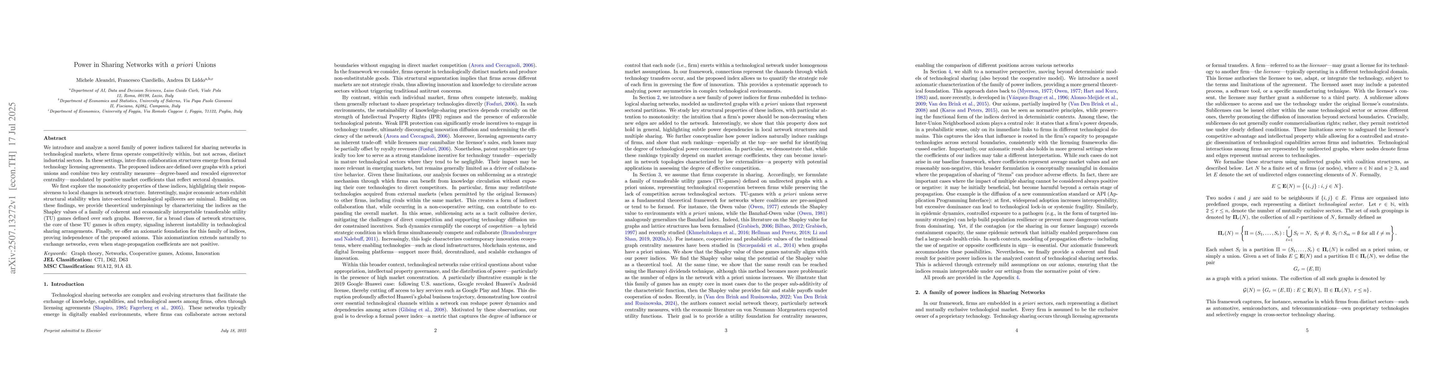 We introduce and analyze a novel family of power indices tailored for sharing networks in technological markets, where firms operate competitively within, but not across, distinct industrial sectors. In these settings, inter-firm collaboration structures emerge from formal technology licensing agreements. The proposed indices are defined over graphs with a priori unions and combine two key centrality measures - degree-based and rescaled eigenvector centrality - modulated by positive market coefficients that reflect sectoral dynamics. We first explore the monotonicity properties of these indices, highlighting their responsiveness to local changes in network structure. Interestingly, major economic actors exhibit structural stability when inter-sectoral technological spillovers are minimal. Building on these findings, we provide theoretical underpinnings by characterizing the indices as the Shapley values of a family of coherent and economically interpretable transferable utility (TU) games defined over such graphs. However, for a broad class of network structures, the core of these TU games is often empty, signaling inherent instability in technological sharing arrangements. Finally, we offer an axiomatic foundation for this family of indices, proving independence of the proposed axioms. This axiomatization extends naturally to exchange networks, even when stage-propagation coefficients are not positive.