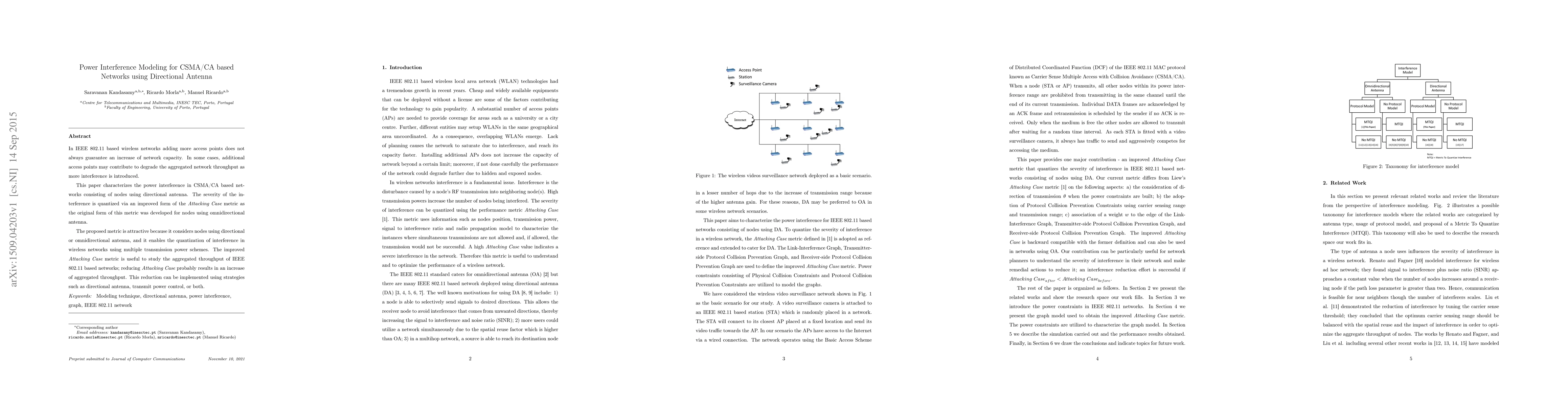 This paper models power interference in CSMA/CA networks with directional antennas, proposing an improved metric for quantifying interference that accounts for both directional and omnidirectional antennas. The study suggests that reducing interference, potentially via directional antennas or power control, can enhance network throughput.