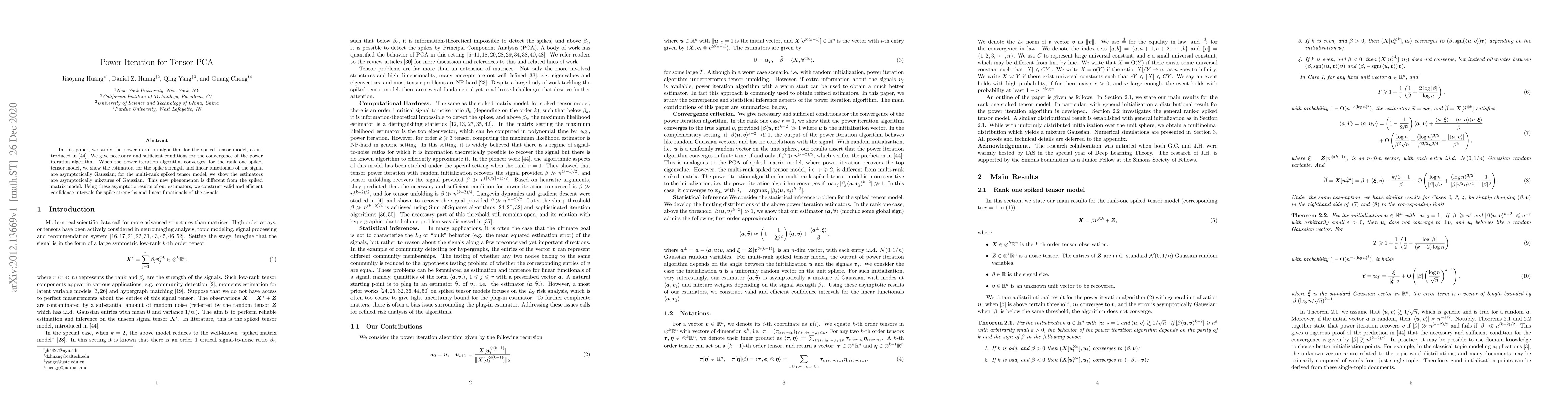 The paper presents new theoretical results on the convergence of the power iteration algorithm for tensor PCA, characterizing the asymptotic distributions of estimators for spike strengths and linear functionals of signals in both rank one and multi-rank spiked tensor models.