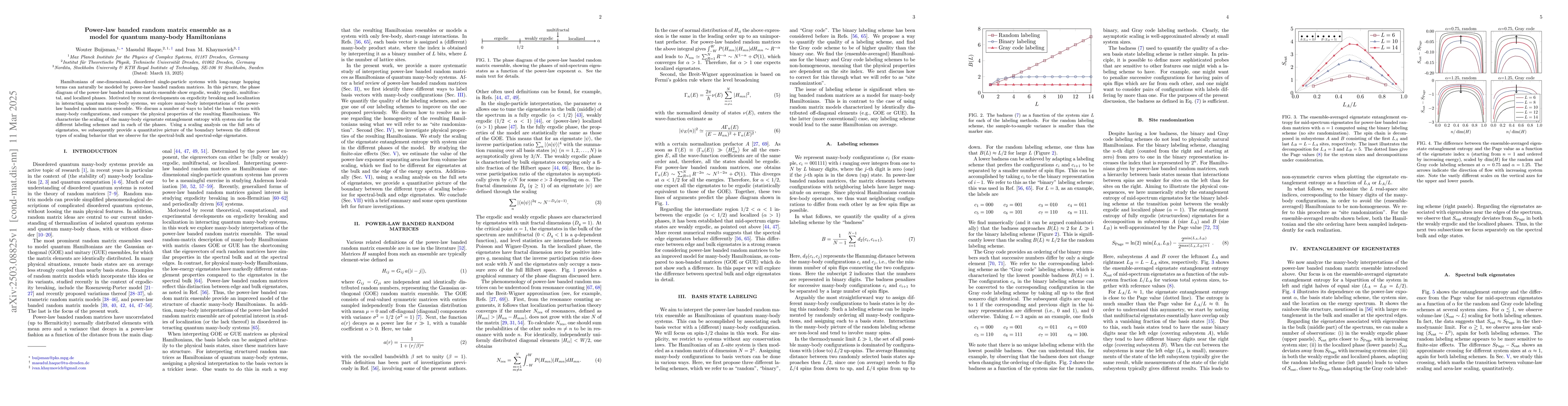 The research explores the power-law banded random matrix ensemble (PLBRM) as a model for quantum many-body Hamiltonians, using various basis labeling schemes and analyzing the scaling of eigenstate entanglement entropy with system size.
