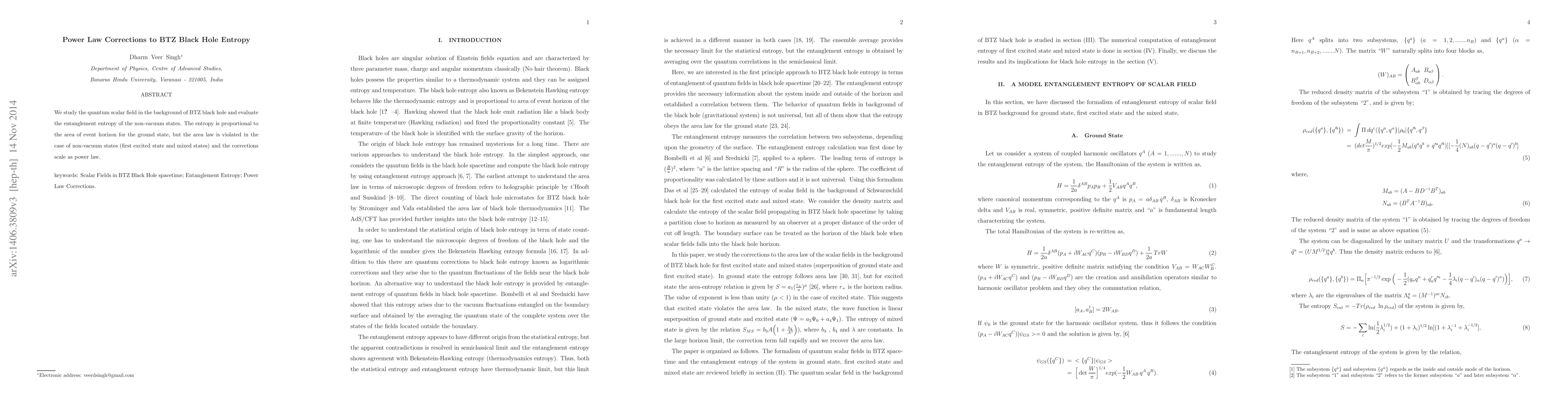 Summary: This paper examines the quantum scalar field in BTZ black hole backgrounds, finding that while ground state entropy follows an area law, higher energy states exhibit power law corrections to this entropy. These corrections arise in non-vacuum states and mixed states.