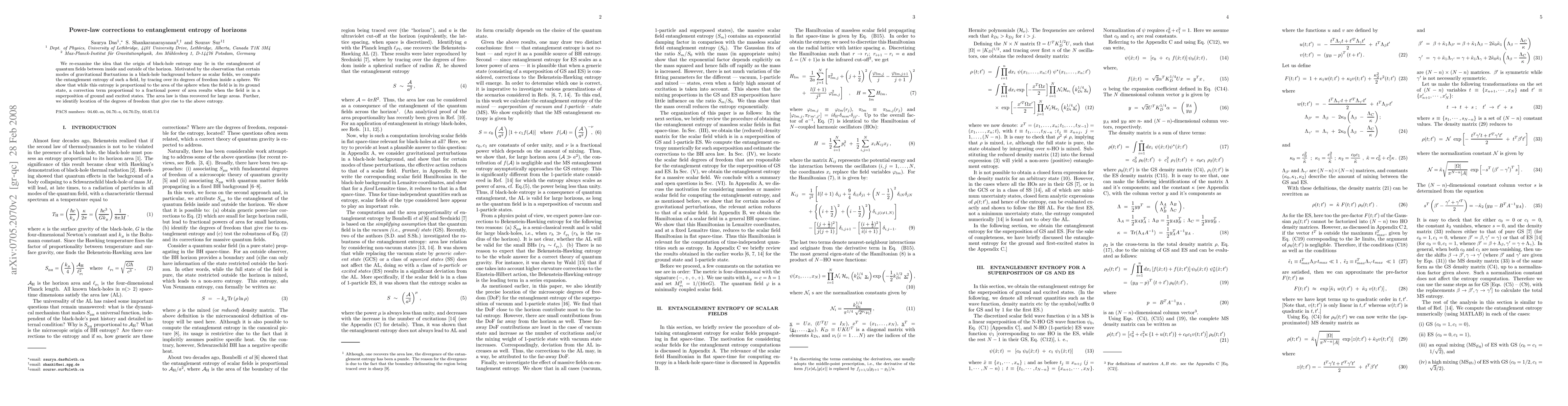 We re-examine the idea that the origin of black-hole entropy may lie in the entanglement of quantum fields between inside and outside of the horizon. Motivated by the observation that certain modes of gravitational fluctuations in a black-hole background behave as scalar fields, we compute the entanglement entropy of such a field, by tracing over its degrees of freedom inside a sphere. We show that while this entropy is proportional to the area of the sphere when the field is in its ground state, a correction term proportional to a fractional power of area results when the field is in a superposition of ground and excited states. The area law is thus recovered for large areas. Further, we identify location of the degrees of freedom that give rise to the above entropy.