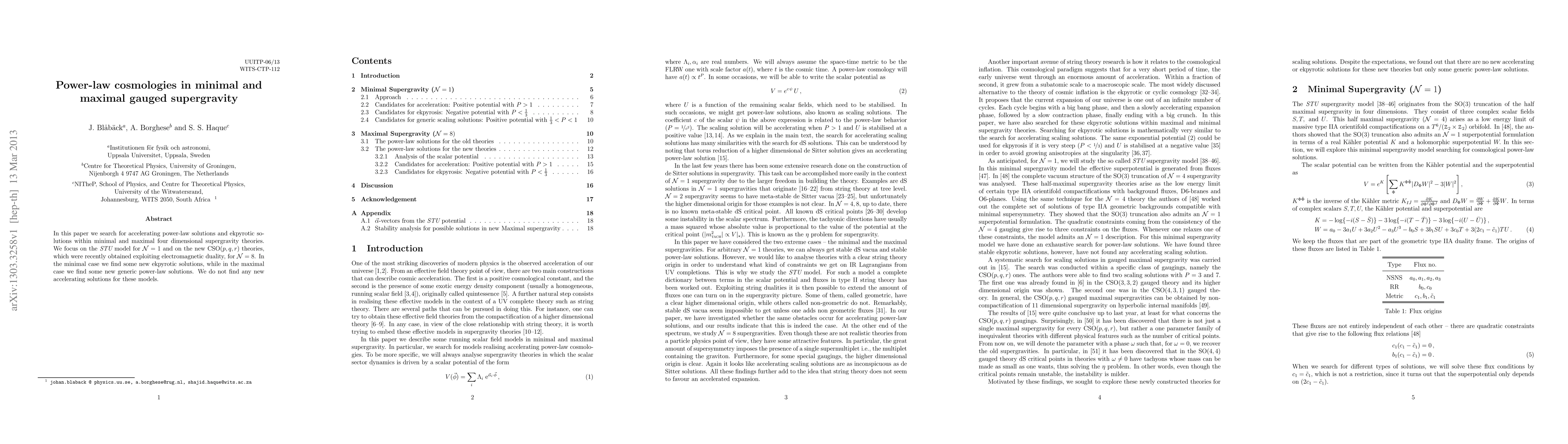 This paper searches for accelerating and ekpyrotic solutions in four-dimensional supergravity theories, but only finds new generic power-law solutions in the maximal case.