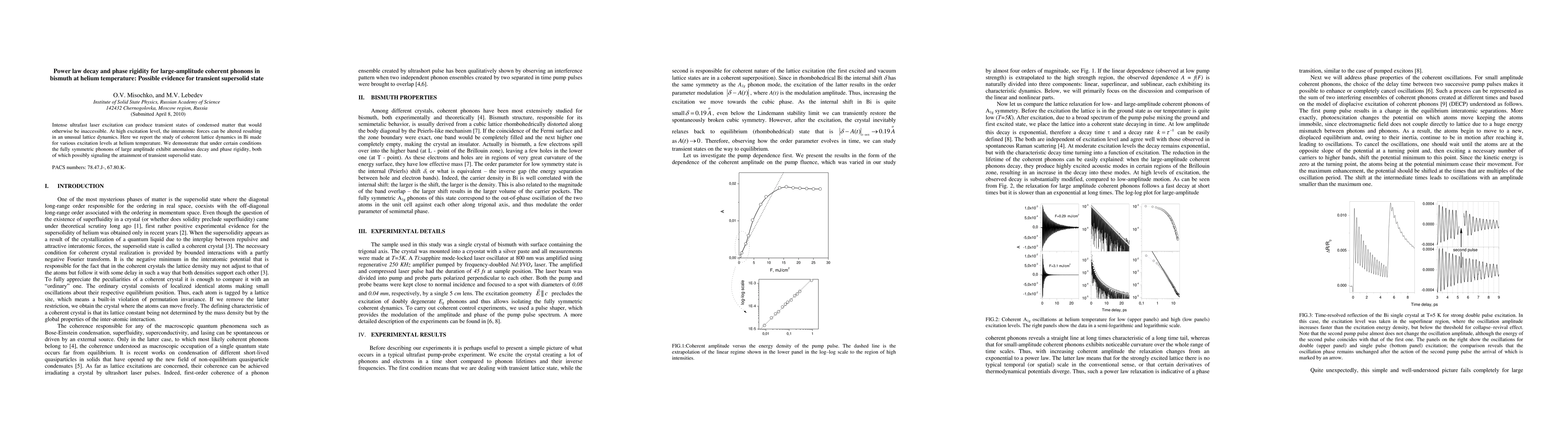 Intense ultrafast laser excitation can produce transient states of condensed matter that would otherwise be inaccessible. At high excitation level, the interatomic forces can be altered resulting in an unusual lattice dynamics. Here we report the study of coherent lattice dynamics in Bi made for various excitation levels at helium temperature. We demonstrate that under certain conditions the fully symmetric phonons of large amplitude exhibit anomalous decay and phase rigidity, both of which possibly signaling the attainment of transient supersolid state.