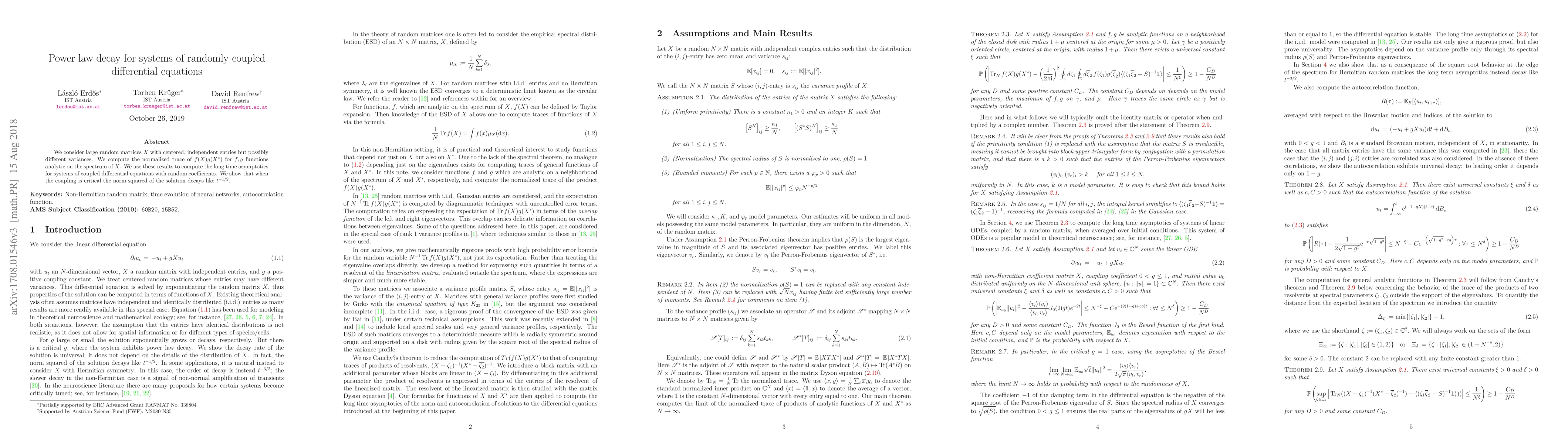 We consider large random matrices $X$ with centered, independent entries but possibly different variances. We compute the normalized trace of $f(X) g(X^*)$ for $f,g$ functions analytic on the spectrum of $X$. We use these results to compute the long time asymptotics for systems of coupled differential equations with random coefficients. We show that when the coupling is critical the norm squared of the solution decays like $t^{-1/2}$.
