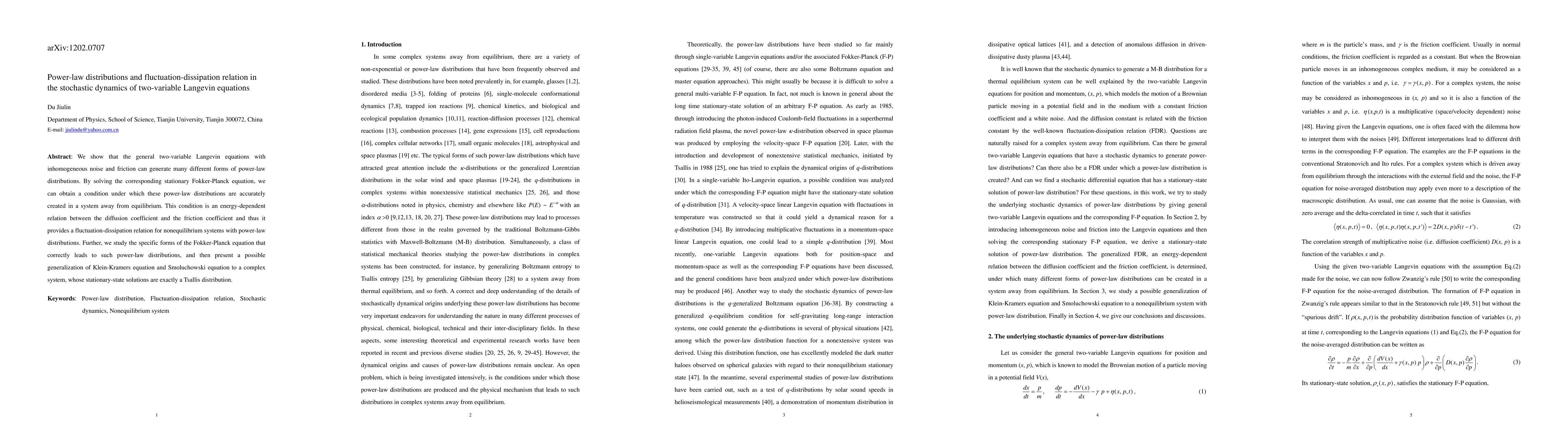 This paper demonstrates that two-variable Langevin equations with non-uniform noise and friction can produce various power-law distributions. It reveals an energy-dependent fluctuation-dissipation relation for nonequilibrium systems, generalizing the Klein-Kramers and Smoluchowski equations to yield exact Tsallis distribution solutions.