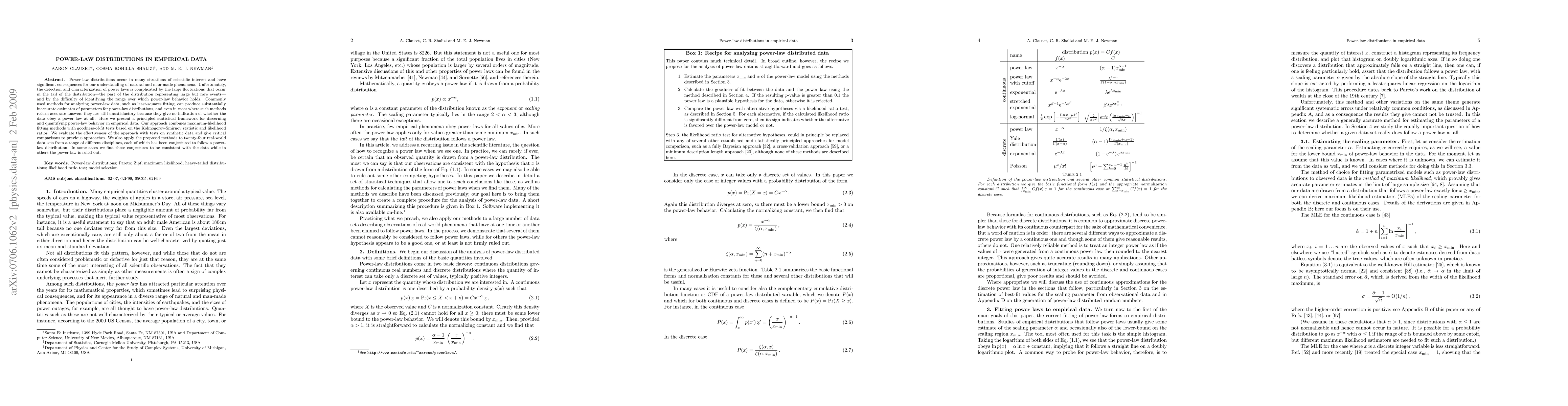 Power-law distributions occur in many situations of scientific interest and have significant consequences for our understanding of natural and man-made phenomena. Unfortunately, the detection and characterization of power laws is complicated by the large fluctuations that occur in the tail of the distribution -- the part of the distribution representing large but rare events -- and by the difficulty of identifying the range over which power-law behavior holds. Commonly used methods for analyzing power-law data, such as least-squares fitting, can produce substantially inaccurate estimates of parameters for power-law distributions, and even in cases where such methods return accurate answers they are still unsatisfactory because they give no indication of whether the data obey a power law at all. Here we present a principled statistical framework for discerning and quantifying power-law behavior in empirical data. Our approach combines maximum-likelihood fitting methods with goodness-of-fit tests based on the Kolmogorov-Smirnov statistic and likelihood ratios. We evaluate the effectiveness of the approach with tests on synthetic data and give critical comparisons to previous approaches. We also apply the proposed methods to twenty-four real-world data sets from a range of different disciplines, each of which has been conjectured to follow a power-law distribution. In some cases we find these conjectures to be consistent with the data while in others the power law is ruled out.