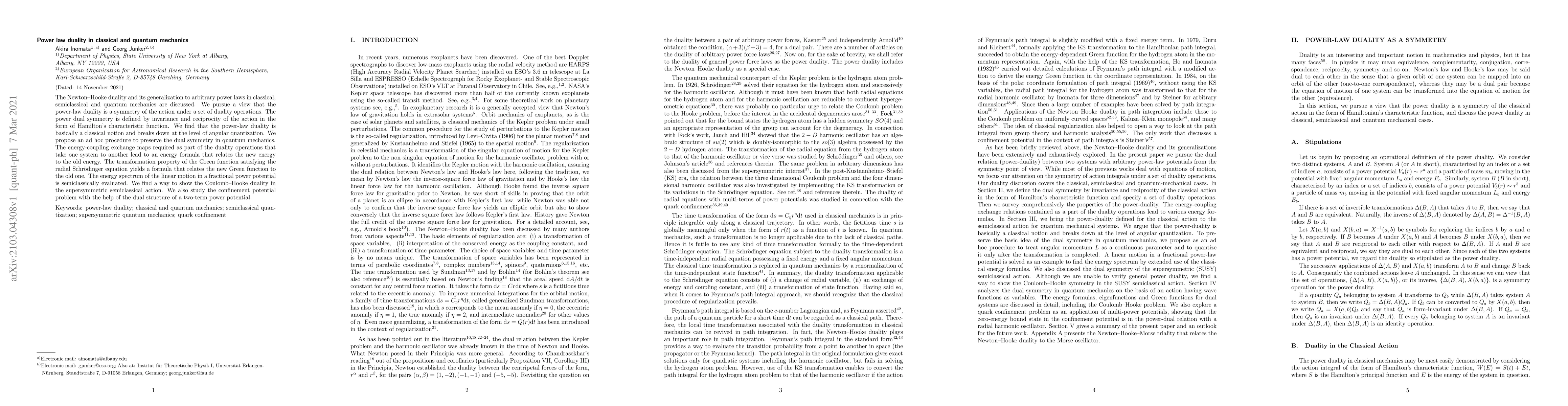 The Newton--Hooke duality and its generalization to arbitrary power laws in classical, semiclassical and quantum mechanics are discussed. We pursue a view that the power-law duality is a symmetry of the action under a set of duality operations. The power dual symmetry is defined by invariance and reciprocity of the action in the form of Hamilton's characteristic function. We find that the power-law duality is basically a classical notion and breaks down at the level of angular quantization. We propose an ad hoc procedure to preserve the dual symmetry in quantum mechanics. The energy-coupling exchange maps required as part of the duality operations that take one system to another lead to an energy formula that relates the new energy to the old energy. The transformation property of {the} Green function satisfying the radial Schr\"odinger equation yields a formula that relates the new Green function to the old one. The energy spectrum of the linear motion in a fractional power potential is semiclassically evaluated. We find a way to show the Coulomb--Hooke duality in the supersymmetric semiclassical action. We also study the confinement potential problem with the help of the dual structure of a two-term power potential.