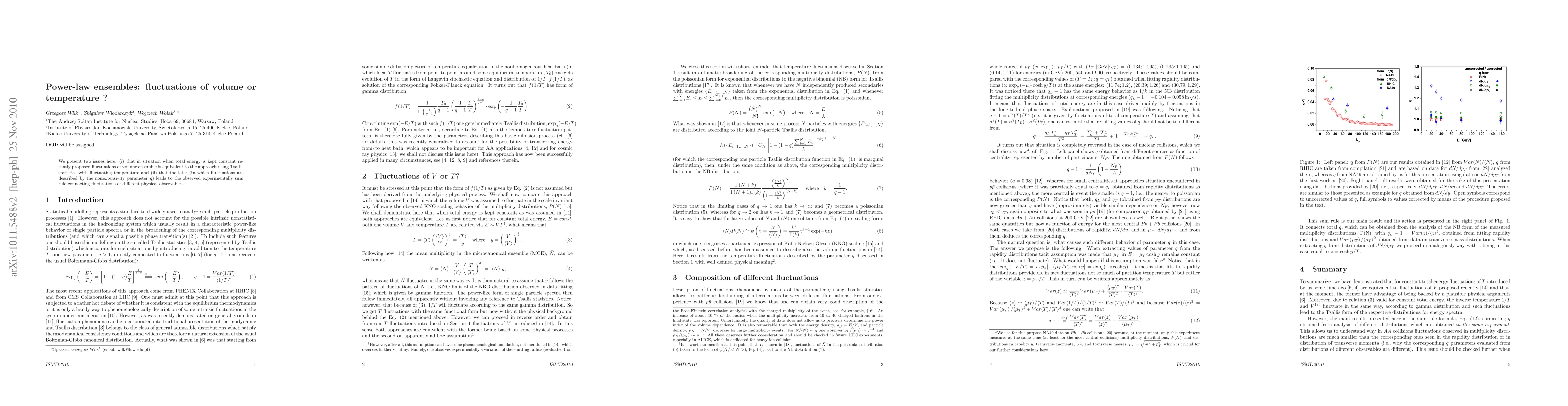 We present two issues here: (i) that in situation when total energy is kept constant recently proposed fluctuations of volume ensemble is equivalent to the approach using Tsallis statistics with fluctuating temperature and (ii) that the later (in which fluctuations are described by the nonextensivity parameter q) leads to the observed experimentally sum rule connecting fluctuations of different physical observables.