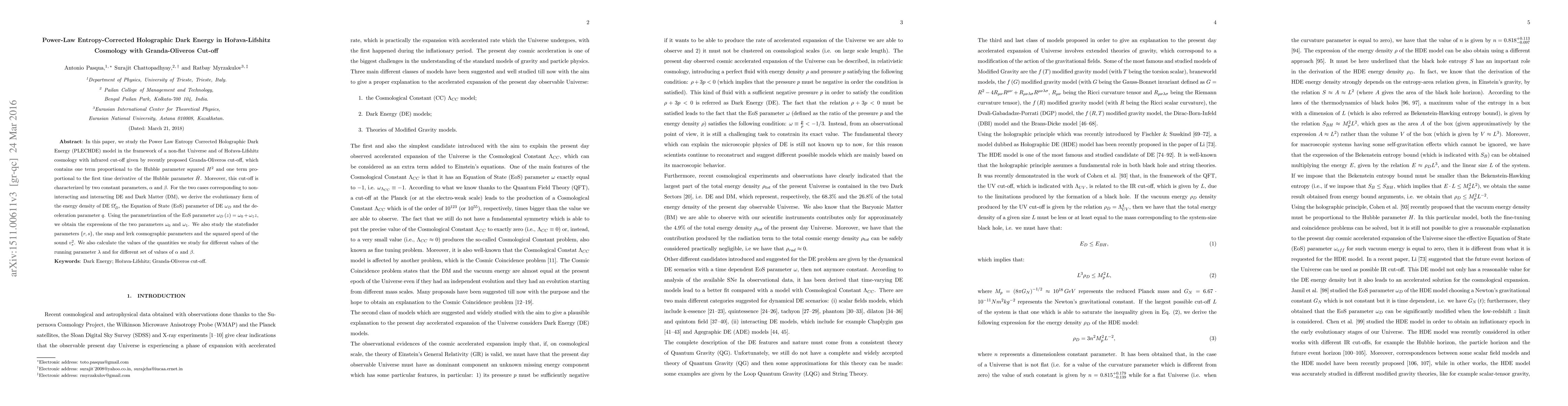 This paper explores the Power Law Entropy Corrected Holographic Dark Energy (PLECHDE) in Hořava-Lifshitz cosmology with a Granda-Oliveros infrared cut-off. It derives the energy density, Equation of State parameter, and deceleration parameter for both non-interacting and interacting dark energy and dark matter scenarios.