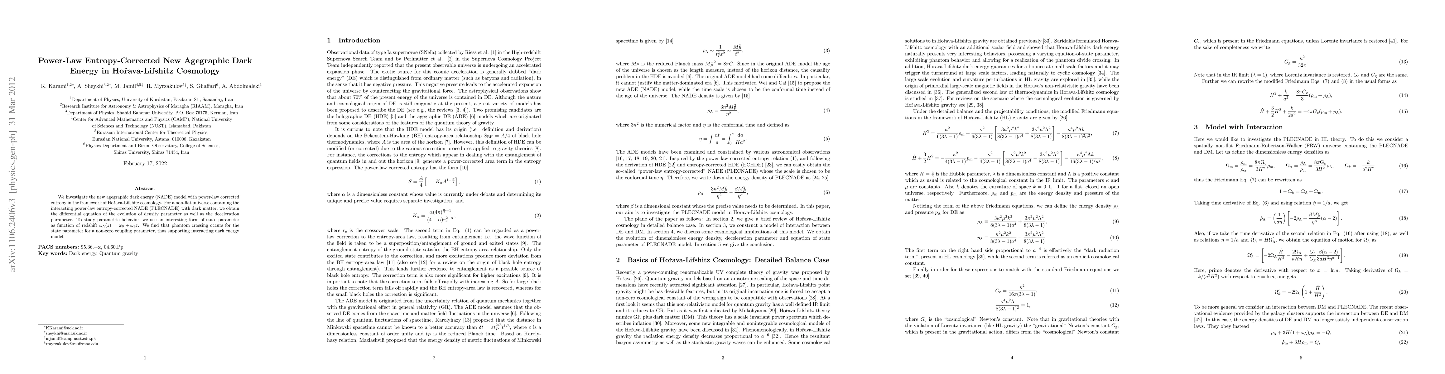 We investigate the new agegraphic dark energy (NADE) model with power-law corrected entropy in the framework of Ho\v{r}ava-Lifshitz cosmology. For a non-flat universe containing the interacting power-law entropy-corrected NADE (PLECNADE) with dark matter, we obtain the differential equation of the evolution of density parameter as well as the deceleration parameter. To study parametric behavior, we used an interesting form of state parameter as function of redshift $\omega_{\Lambda}(z)=\omega_0+\omega_1 z$. We found that phantom crossing occurs for the state parameter for a non-zero coupling parameter, thus supporting interacting dark energy model.