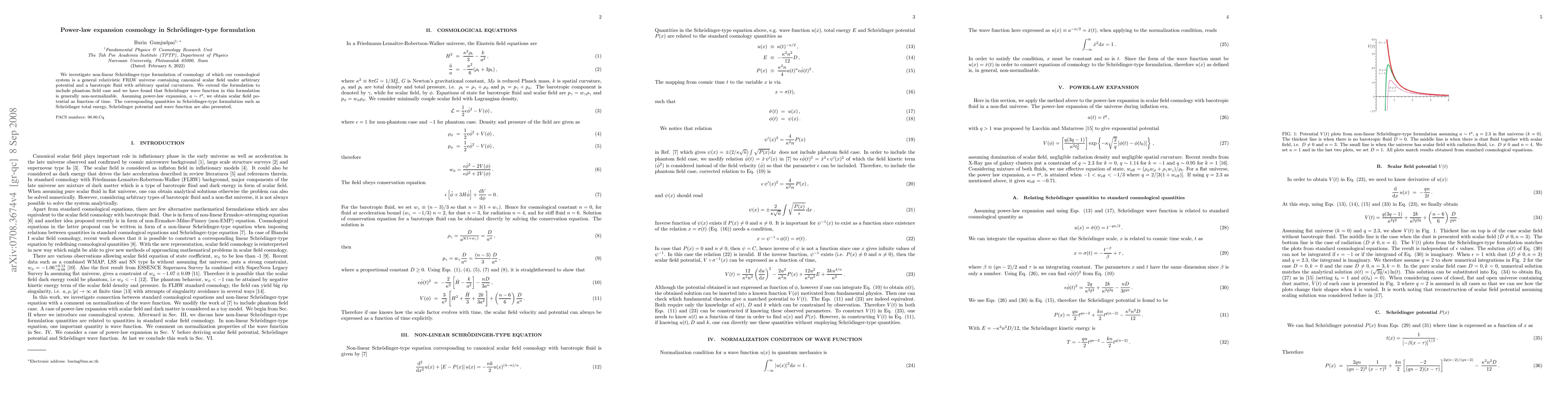 We investigate non-linear Schr\"{o}dinger-type formulation of cosmology of which our cosmological system is a general relativistic FRLW universe containing canonical scalar field under arbitrary potential and a barotropic fluid with arbitrary spatial curvatures. We extend the formulation to include phantom field case and we have found that Schr\"{o}dinger wave function in this formulation is generally non-normalizable. Assuming power-law expansion, $a \sim t^q$, we obtain scalar field potential as function of time. The corresponding quantities in Schr\"{o}dinger-type formulation such as Schr\"{o}dinger total energy, Schr\"{o}dinger potential and wave function are also presented.