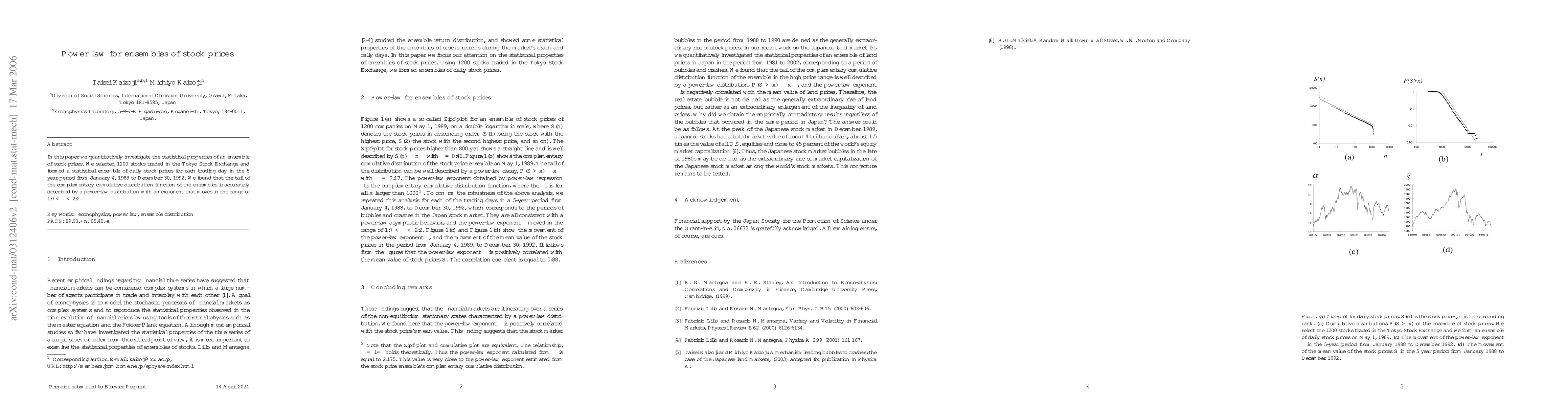 A study of 1200 Tokyo Stock Exchange stocks found that their daily prices follow a power-law distribution with an exponent range of $1.7 < eta < 2.2$.