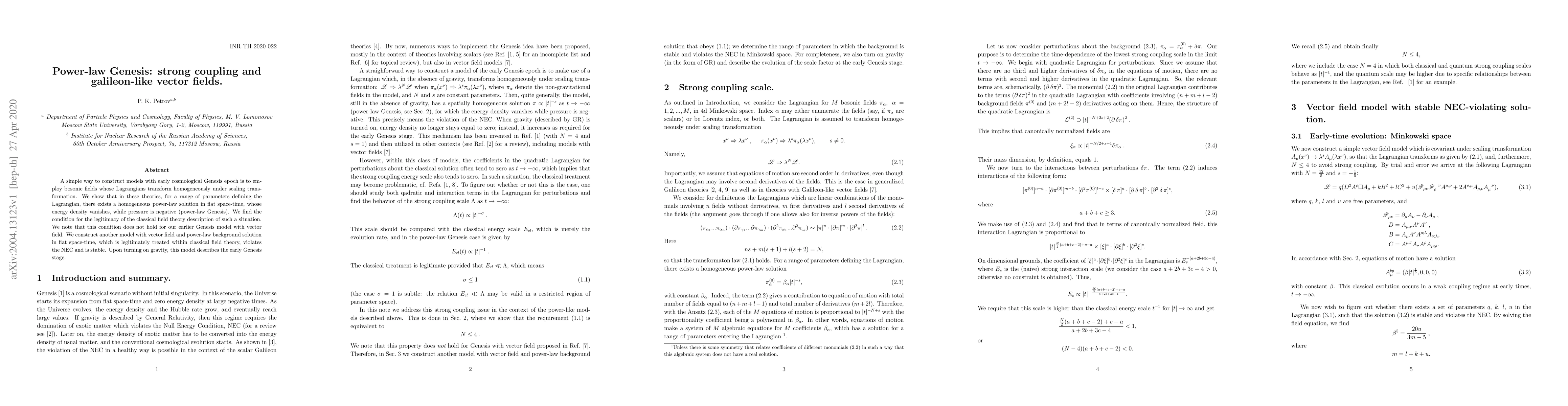 A simple way to construct models with early cosmological Genesis epoch is to employ bosonic fields whose Lagrangians transform homogeneously under scaling transformation. We show that in these theories, for a range of parameters defining the Lagrangian, there exists a homogeneous power-law solution in flat space-time, whose energy density vanishes, while pressure is negative (power-law Genesis). We find the condition for the legitimacy of the classical field theory description of such a situation. We note that this condition does not hold for our earlier Genesis model with vector field. We construct another model with vector field and power-law background solution in flat space-time, which is legitimately treated within classical field theory, violates the NEC and is stable. Upon turning on gravity, this model describes the early Genesis stage.