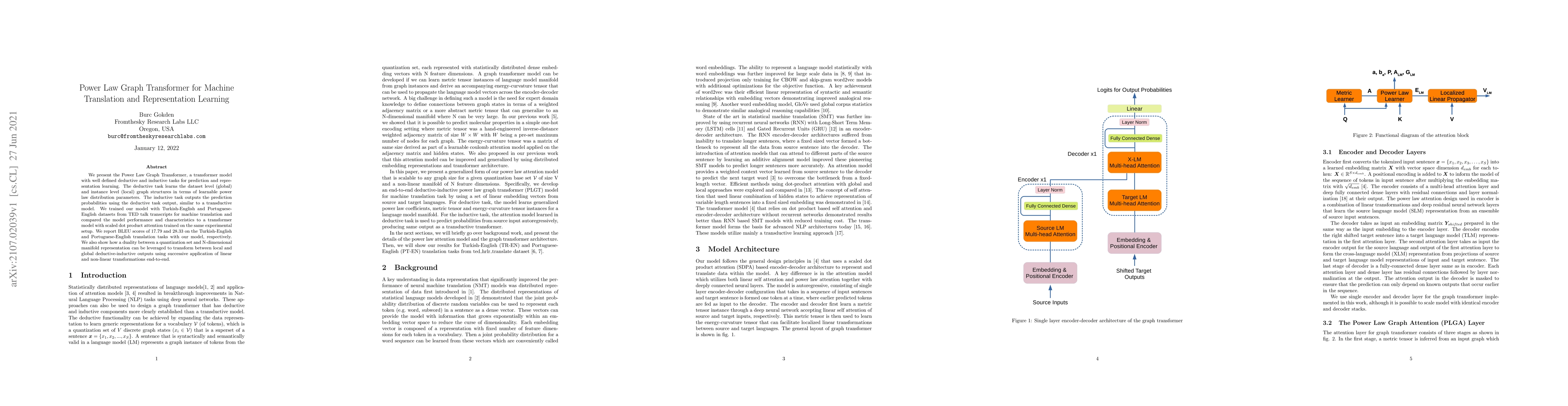 We present the Power Law Graph Transformer, a transformer model with well defined deductive and inductive tasks for prediction and representation learning. The deductive task learns the dataset level (global) and instance level (local) graph structures in terms of learnable power law distribution parameters. The inductive task outputs the prediction probabilities using the deductive task output, similar to a transductive model. We trained our model with Turkish-English and Portuguese-English datasets from TED talk transcripts for machine translation and compared the model performance and characteristics to a transformer model with scaled dot product attention trained on the same experimental setup. We report BLEU scores of $17.79$ and $28.33$ on the Turkish-English and Portuguese-English translation tasks with our model, respectively. We also show how a duality between a quantization set and N-dimensional manifold representation can be leveraged to transform between local and global deductive-inductive outputs using successive application of linear and non-linear transformations end-to-end.
