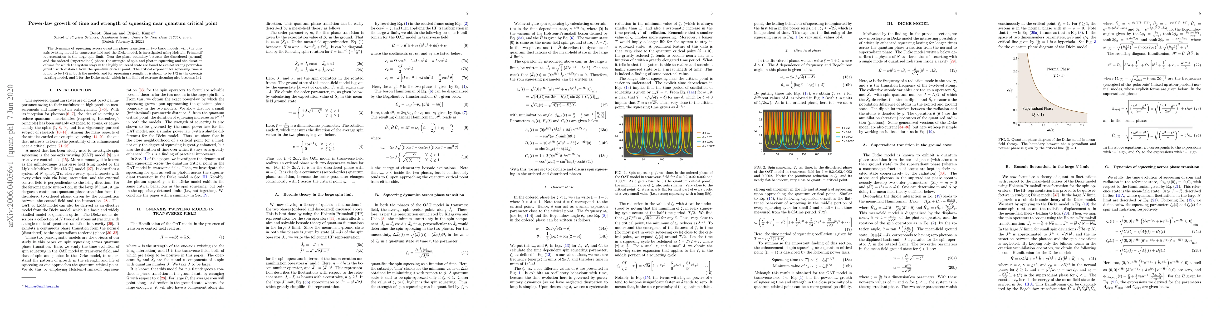 The dynamics of squeezing across quantum phase transition in two basic models, viz., the one-axis twisting model in transverse field and the Dicke model, is investigated using Holstein-Primakoff representation in the large spin limit. Near the phase boundary between the disordered (normal) and the ordered (superradiant) phase, the strength of spin and photon squeezing and the duration of time for which the system stays in the highly squeezed state are found to exhibit strong power-law growth with distance from the quantum critical point. The critical exponent for squeezing time is found to be 1/2 in both the models, and for squeezing strength, it is shown to be 1/2 in the one-axis twisting model, and 1 for the Dicke model which in the limit of extreme detuning also becomes 1/2.