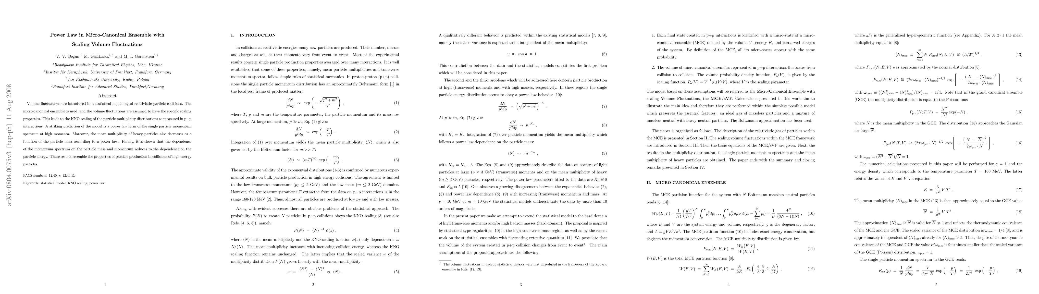 This paper explores the micro-canonical ensemble with volume fluctuations in relativistic particle collisions, predicting a power law for high momentum single particle spectra and a power law decrease in mean multiplicity with particle mass. The findings align with observed properties in high-energy particle collisions.