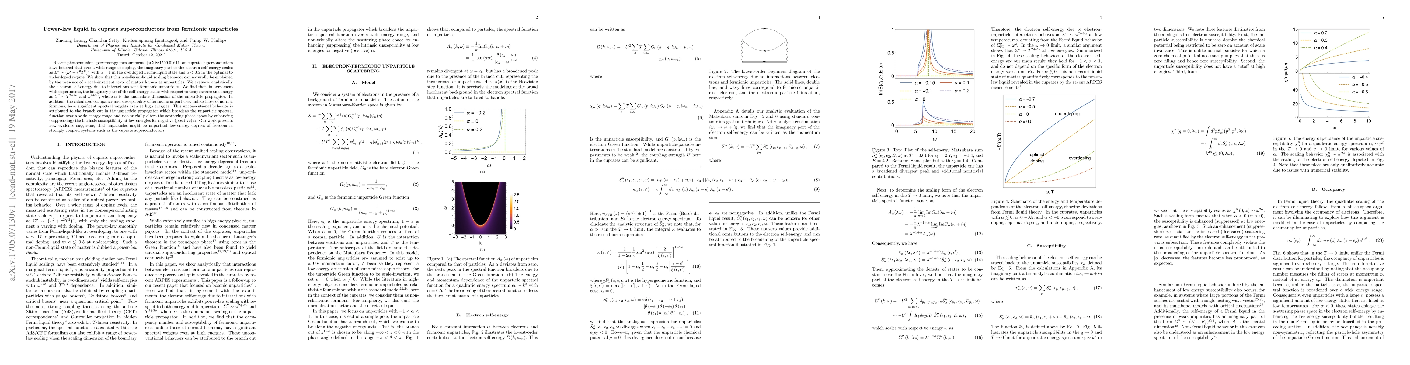 Recent photoemission spectroscopy measurements [arXiv:1509.01611] on cuprate superconductors have inferred that over a wide range of doping, the imaginary part of the electron self-energy scales as $\Sigma^{\prime\prime}\sim(\omega^2+\pi^2T^2)^a$ with $a=1$ in the overdoped Fermi-liquid state and $a<0.5$ in the optimal to underdoped regime. We show that this non-Fermi-liquid scaling behavior can naturally be explained by the presence of a scale-invariant state of matter known as unparticles. We evaluate analytically the electron self-energy due to interactions with fermionic unparticles. We find that, in agreement with experiments, the imaginary part of the self-energy scales with respect to temperature and energy as $\Sigma^{\prime\prime}\sim T^{2+2\alpha}$ and $\omega^{2+2\alpha}$, where $\alpha$ is the anomalous dimension of the unparticle propagator. In addition, the calculated occupancy and susceptibility of fermionic unparticles, unlike those of normal fermions, have significant spectral weights even at high energies. This unconventional behavior is attributed to the branch cut in the unparticle propagator which broadens the unparticle spectral function over a wide energy range and non-trivially alters the scattering phase space by enhancing (suppressing) the intrinsic susceptibility at low energies for negative (positive) $\alpha$. Our work presents new evidence suggesting that unparticles might be important low-energy degrees of freedom in strongly coupled systems such as the cuprate superconductors.