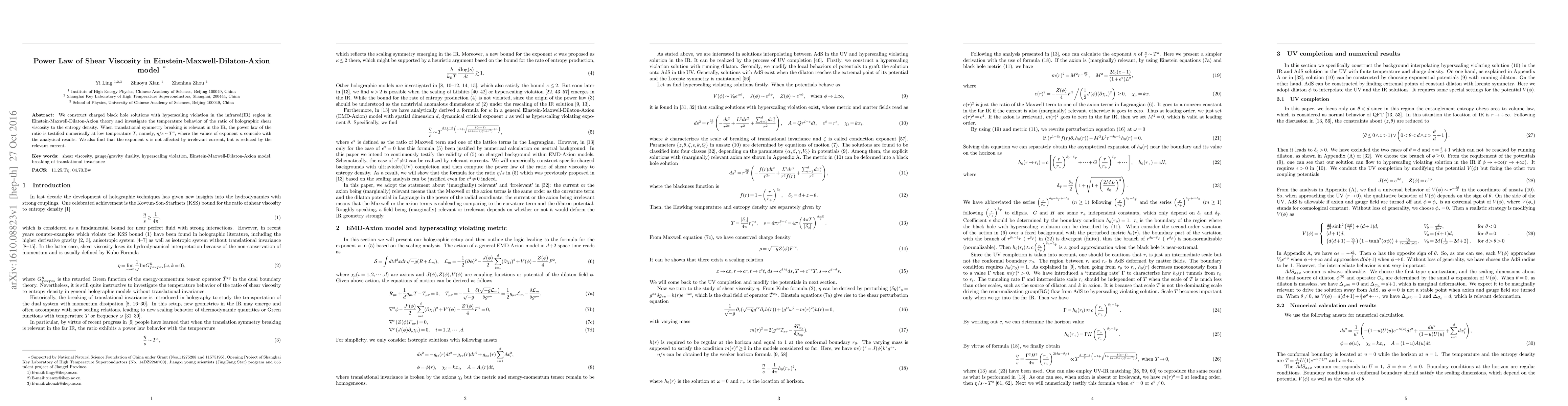 We construct charged black hole solutions with hyperscaling violation in the infrared(IR) region in Einstein-Maxwell-Dilaton-Axion theory and investigate the temperature behavior of the ratio of holographic shear viscosity to the entropy density. When translational symmetry breaking is relevant in the IR, the power law of the ratio is testified numerically at low temperature $T$, namely, $\eta/s\sim T^\kappa$, where the values of exponent $\kappa$ coincide with the analytical results. We also find that the exponent $\kappa$ is not affected by irrelevant current, but is reduced by the relevant current.
