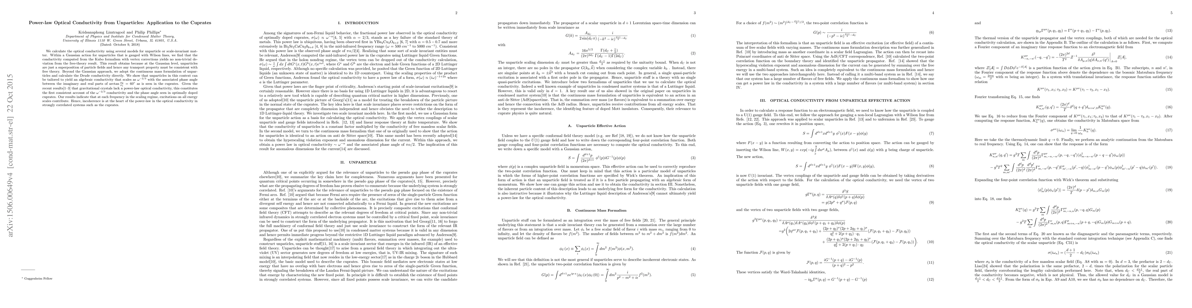 We calculate the optical conductivity using several models for unparticle or scale-invariant matter. Within a Gaussian action for unparticles that is gauged with Wilson lines, we find that the conductivity computed from the Kubo formalism with vertex corrections yields no non-trivial deviation from the free-theory result. This result obtains because at the Gaussian level, unparticles are just a superposition of particle fields and hence any transport property must be consistent with free theory. Beyond the Gaussian approach, we adopt the continuous mass formulation of unparticles and calculate the Drude conductivity directly. We show that unparticles in this context can be tailored to yield an algebraic conductivity that scales as $\omega^{-2/3}$ with the associated phase angle between the imaginary and real parts of $\arctan\frac{\sigma_2}{\sigma_1}=60^\circ$ as is seen in the cuprates. Given the recent results\cite{Donos2014,Rangamani2015,Langley} that gravitational crystals lack a power-law optical conductivity, this constitutes the first consistent account of the $\omega^{-2/3}$ conductivity and the phase angle seen in optimally doped cuprates. Our results indicate that at each frequency in the scaling regime, excitations on all energy scales contribute. Hence, incoherence is at the heart of the power-law in the optical conductivity in strongly correlated systems such as the cuprates.