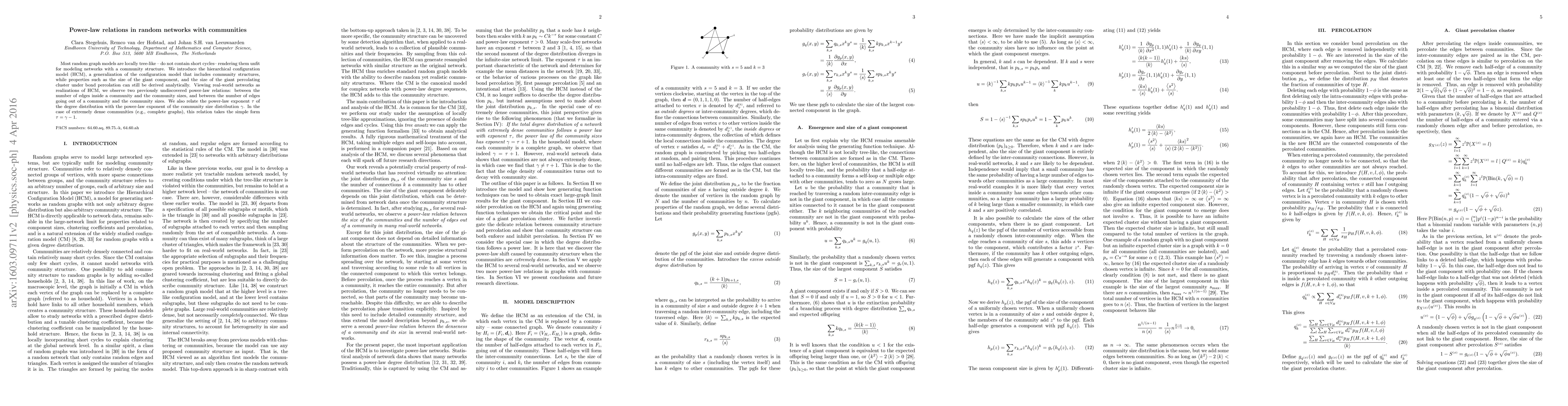 This paper introduces the hierarchical configuration model (HCM) to represent random networks with community structures, revealing two new power-law relations: one between community size and internal edges, and another between community size and external edges. It also connects the degree distribution's power-law exponent to the community size distribution's exponent, with a simple relation for dense communities.