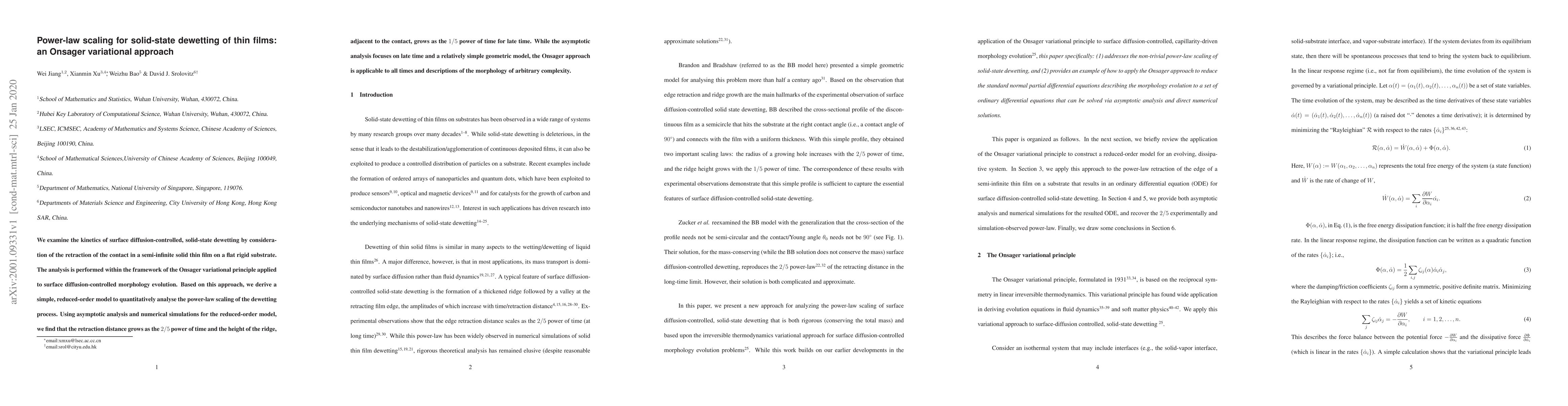 We examine the kinetics of surface diffusion-controlled, solid-state dewetting by consideration of the retraction of the contact in a semi-infinite solid thin film on a flat rigid substrate. The analysis is performed within the framework of the Onsager variational principle applied to surface diffusion-controlled morphology evolution. Based on this approach, we derive a simple, reduced-order model to quantitatively analyse the power-law scaling of the dewetting process. Using asymptotic analysis and numerical simulations for the reduced-order model, we find that the retraction distance grows as the $2/5$ power of time and the height of the ridge, adjacent to the contact, grows as the $1/5$ power of time for late time. While the asymptotic analysis focuses on late time and a relatively simple geometric model, the Onsager approach is applicable to all times and descriptions of the morphology of arbitrary complexity.