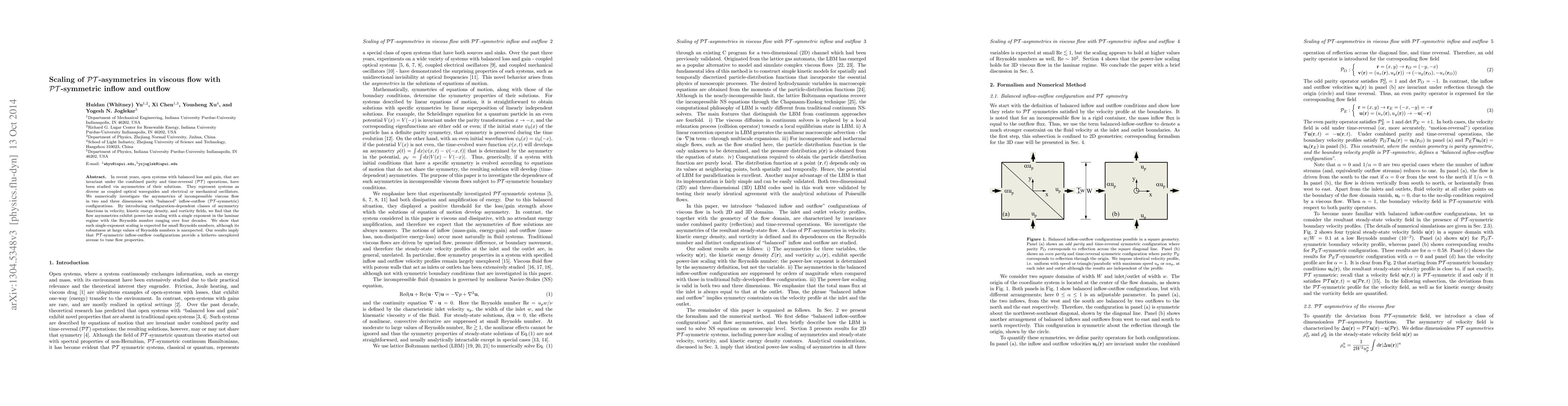 In recent years, open systems with balanced loss and gain, that are invariant under the combined parity and time-reversal ($\mathcal{PT}$) operations, have been studied via asymmetries of their solutions. They represent systems as diverse as coupled optical waveguides and electrical or mechanical oscillators. We numerically investigate the asymmetries of incompressible viscous flow in two and three dimensions with "balanced" inflow-outflow ($\mathcal{PT}$-symmetric) configurations. By introducing configuration-dependent classes of asymmetry functions in velocity, kinetic energy density, and vorticity fields, we find that the flow asymmetries exhibit power-law scaling with a single exponent in the laminar regime with the Reynolds number ranging over four decades. We show that such single-exponent scaling is expected for small Reynolds numbers, although its robustness at large values of Reynolds numbers is unexpected. Our results imply that $\mathcal{PT}$-symmetric inflow-outflow configurations provide a hitherto unexplored avenue to tune flow properties.