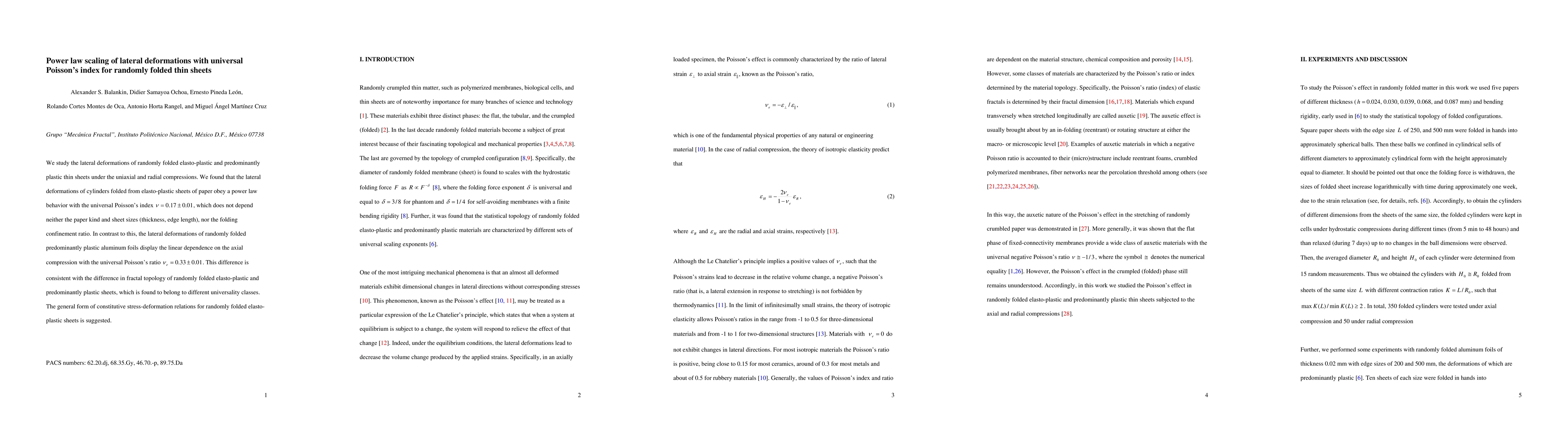 This study investigates the lateral deformations of randomly folded thin sheets under compression, revealing a power law scaling for elastoplastic paper with a universal Poisson's index of 0.17, contrasting with a linear dependence for predominantly plastic aluminum foils with a Poisson's ratio of 0.33. The findings suggest different universality classes based on the fractal topology of the folded sheets.