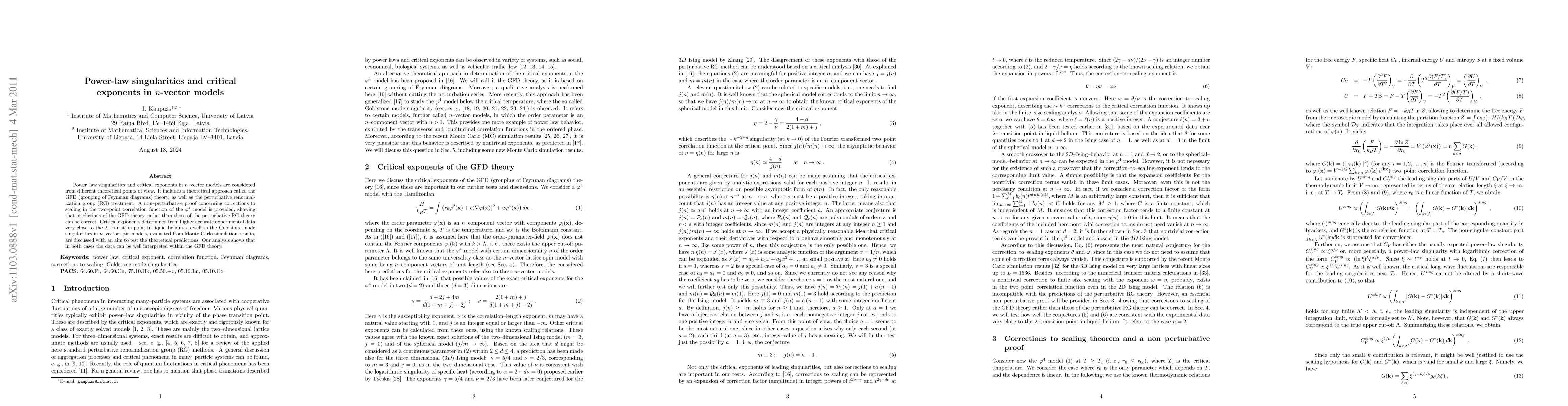 Power-law singularities and critical exponents in n-vector models are considered from different theoretical points of view. It includes a theoretical approach called the GFD (grouping of Feynman diagrams) theory, as well as the perturbative renormalization group (RG) treatment. A non-perturbative proof concerning corrections to scaling in the two-point correlation function of the phi^4 model is provided, showing that predictions of the GFD theory rather than those of the perturbative RG theory can be correct. Critical exponents determined from highly accurate experimental data very close to the lambda-transition point in liquid helium, as well as the Goldstone mode singularities in n-vector spin models, evaluated from Monte Carlo simulation results, are discussed with an aim to test the theoretical predictions. Our analysis shows that in both cases the data can be well interpreted within the GFD theory.