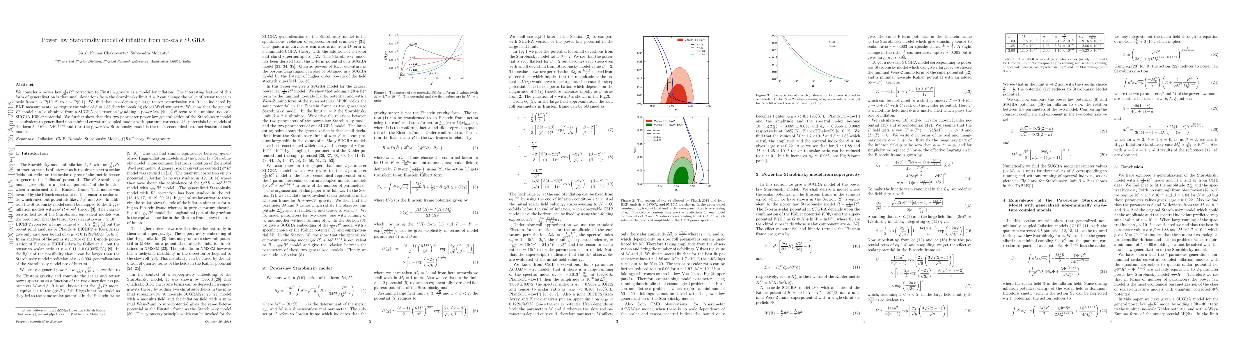 We consider a power law $\frac{1}{M^2}R^{\beta}$ correction to Einstein gravity as a model of inflation. The interesting feature of this form of generalization is that small deviations from the Starobinsky limit $\beta=2$ can change the value of tensor to scalar ratio from $r \sim \mathcal{O}(10^{-3})$ to $r\sim \mathcal{O}(0.1)$. We find that in order to get large tensor perturbation $r\approx 0.1$ as indicated by BKP measurements, we require the value of $\beta \approx 1.83$ thereby breaking global Weyl symmetry. We show that the general $R^\beta$ model can be obtained from a SUGRA construction by adding a power law $(\Phi +\bar \Phi)^n$ term to the minimal no-scale SUGRA K\"ahler potential. We further show that this two parameter power law generalization of the Starobinsky model is equivalent to generalized non-minimal curvature coupled models with quantum corrected $\Phi^{4}$- potentials i.e. models of the form $\xi \Phi^{a} R^{b} + \lambda \Phi^{4(1+\gamma)}$ and thus the power law Starobinsky model is the most economical parametrization of such models.