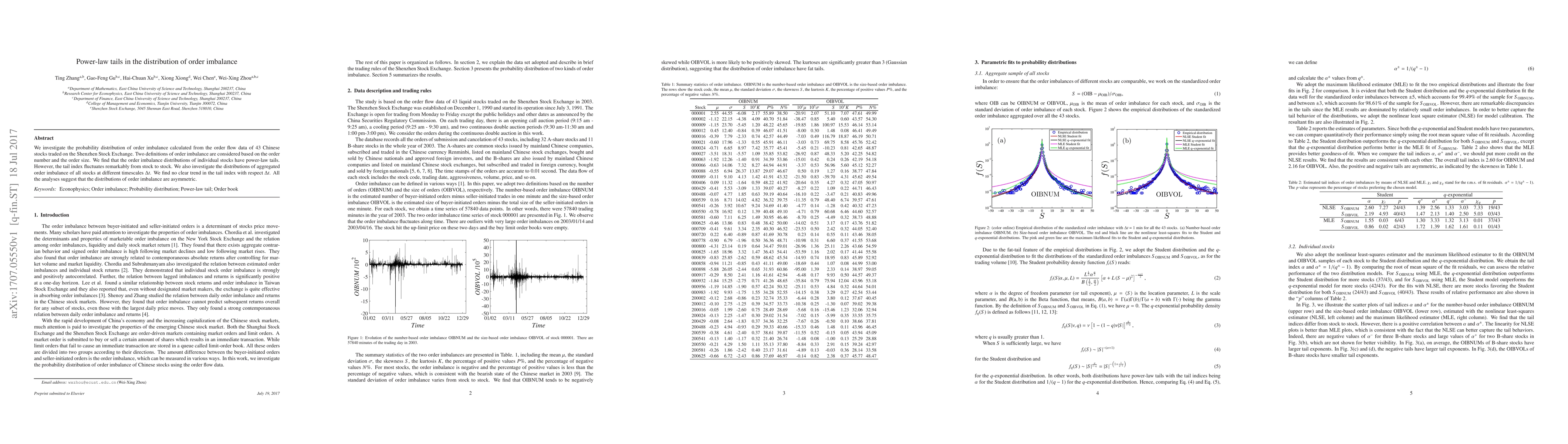 This study examines the order imbalance distributions of 43 Chinese stocks on the Shenzhen Stock Exchange, revealing power-law tails in individual stock imbalances, though the tail index varies significantly across stocks. Aggregated order imbalance distributions also show no clear trend in tail index with time, indicating asymmetric distribution patterns.