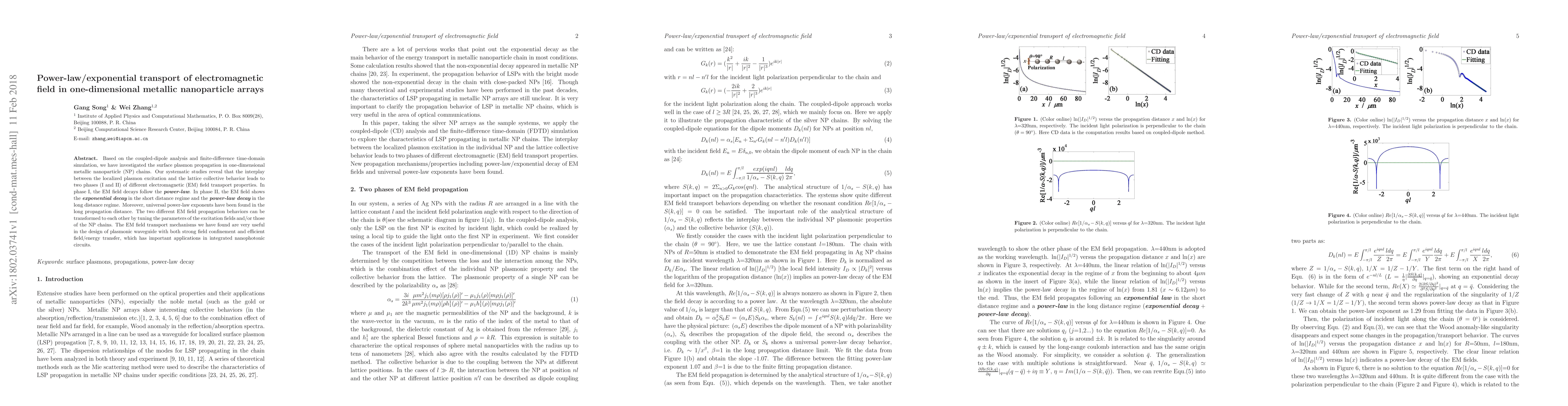 This paper investigates surface plasmon propagation in one-dimensional metallic nanoparticle arrays, revealing two distinct phases of electromagnetic field transport: power-law decay in phase I and a mix of exponential and power-law decay in phase II, with universal power-law exponents in long distances. The findings aid in designing plasmonic waveguides for efficient field/energy transfer in integrated nanophotonic circuits.