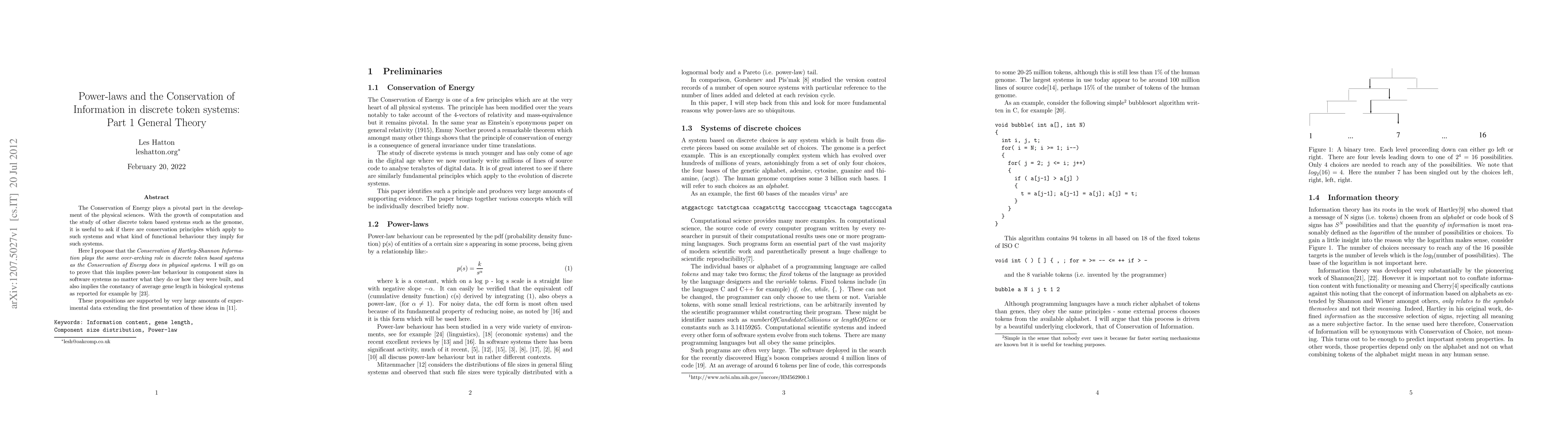 The Conservation of Energy plays a pivotal part in the development of the physical sciences. With the growth of computation and the study of other discrete token based systems such as the genome, it is useful to ask if there are conservation principles which apply to such systems and what kind of functional behaviour they imply for such systems. Here I propose that the Conservation of Hartley-Shannon Information plays the same over-arching role in discrete token based systems as the Conservation of Energy does in physical systems. I will go on to prove that this implies power-law behaviour in component sizes in software systems no matter what they do or how they were built, and also implies the constancy of average gene length in biological systems as reported for example by Lin Xu et al (10.1093/molbev/msk019). These propositions are supported by very large amounts of experimental data extending the first presentation of these ideas in Hatton (2011, IFIP / SIAM / NIST Working Conference on Uncertainty Quantification in Scientific Computing, Boulder, August 2011).