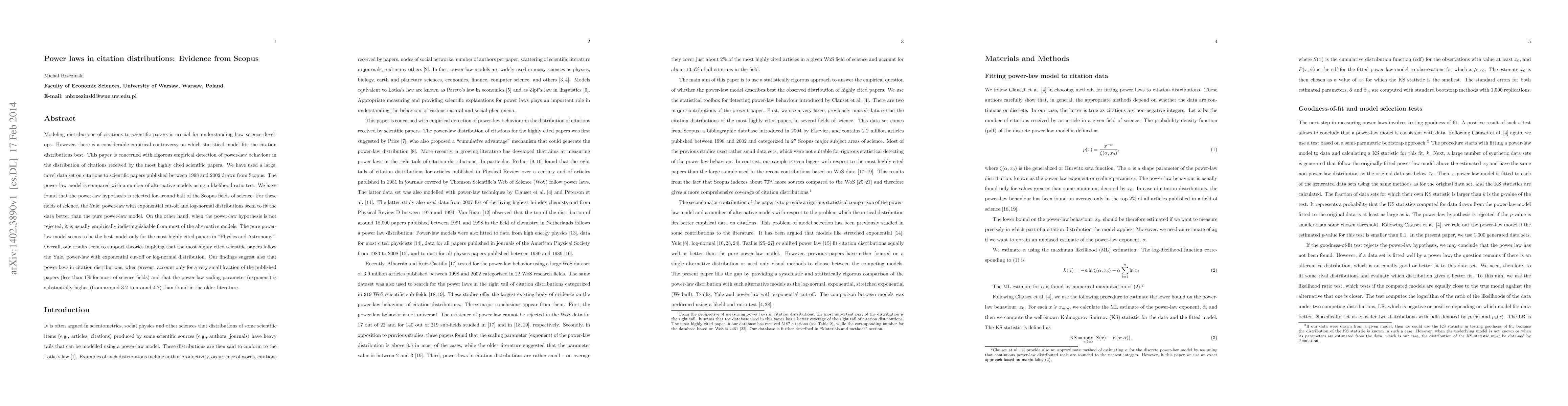 Modeling distributions of citations to scientific papers is crucial for understanding how science develops. However, there is a considerable empirical controversy on which statistical model fits the citation distributions best. This paper is concerned with rigorous empirical detection of power-law behaviour in the distribution of citations received by the most highly cited scientific papers. We have used a large, novel data set on citations to scientific papers published between 1998 and 2002 drawn from Scopus. The power-law model is compared with a number of alternative models using a likelihood ratio test. We have found that the power-law hypothesis is rejected for around half of the Scopus fields of science. For these fields of science, the Yule, power-law with exponential cut-off and log-normal distributions seem to fit the data better than the pure power-law model. On the other hand, when the power-law hypothesis is not rejected, it is usually empirically indistinguishable from most of the alternative models. The pure power-law model seems to be the best model only for the most highly cited papers in "Physics and Astronomy". Overall, our results seem to support theories implying that the most highly cited scientific papers follow the Yule, power-law with exponential cut-off or log-normal distribution. Our findings suggest also that power laws in citation distributions, when present, account only for a very small fraction of the published papers (less than 1% for most of science fields) and that the power-law scaling parameter (exponent) is substantially higher (from around 3.2 to around 4.7) than found in the older literature.