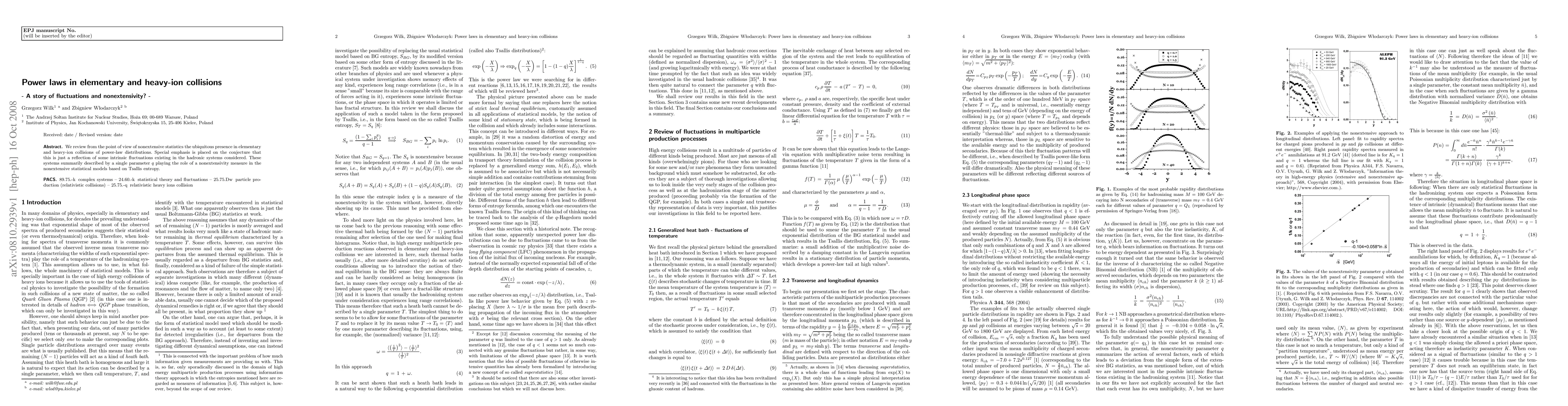 We review from the point of view of nonextensive statistics the ubiquitous presence in elementary and heavy-ion collisions of power-law distributions. Special emphasis is placed on the conjecture that this is just a reflection of some intrinsic fluctuations existing in the hadronic systems considered. These systems summarily described by a single parameter q playing the role of a nonextensivity measure in the nonextensive statistical models based on Tsallis entropy.