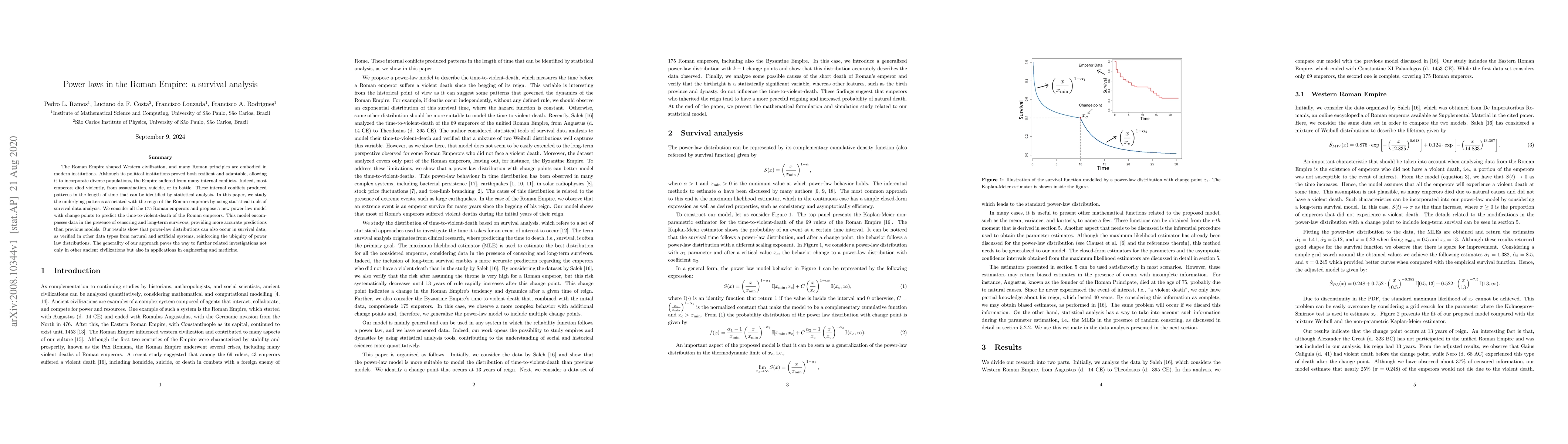 The Roman Empire shaped Western civilization, and many Roman principles are embodied in modern institutions. Although its political institutions proved both resilient and adaptable, allowing it to incorporate diverse populations, the Empire suffered from many internal conflicts. Indeed, most emperors died violently, from assassination, suicide, or in battle. These internal conflicts produced patterns in the length of time that can be identified by statistical analysis. In this paper, we study the underlying patterns associated with the reign of the Roman emperors by using statistical tools of survival data analysis. We consider all the 175 Roman emperors and propose a new power-law model with change points to predict the time-to-violent-death of the Roman emperors. This model encompasses data in the presence of censoring and long-term survivors, providing more accurate predictions than previous models. Our results show that power-law distributions can also occur in survival data, as verified in other data types from natural and artificial systems, reinforcing the ubiquity of power law distributions. The generality of our approach paves the way to further related investigations not only in other ancient civilizations but also in applications in engineering and medicine.