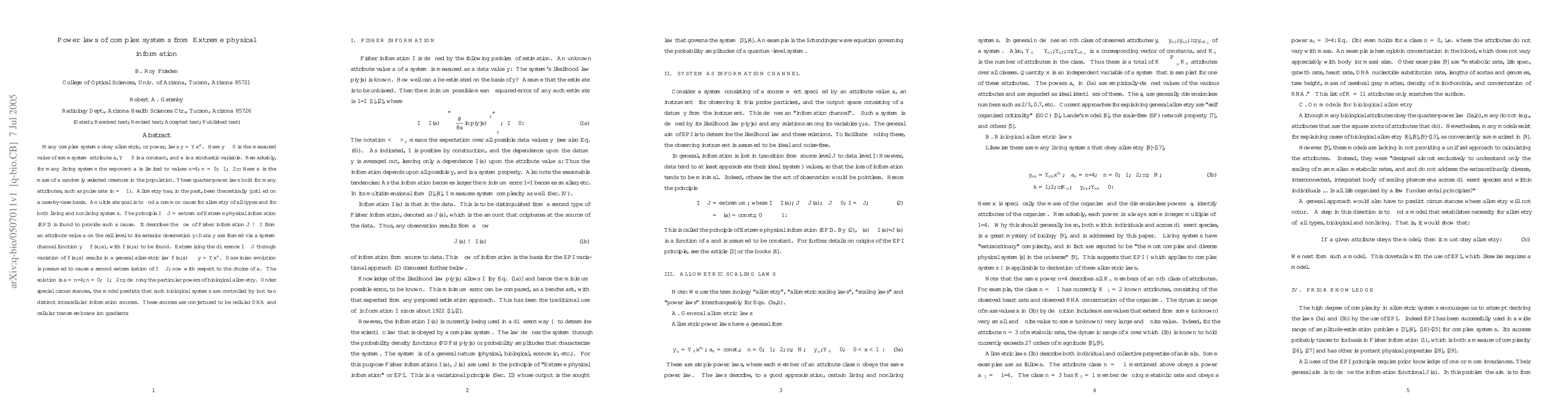 A new theory called Extreme physical information explains how many complex systems obey power laws, known as allometry, with exponents limited to + or - n/4 for living systems. This finding suggests that cellular DNA and ion gradients may control biological systems.