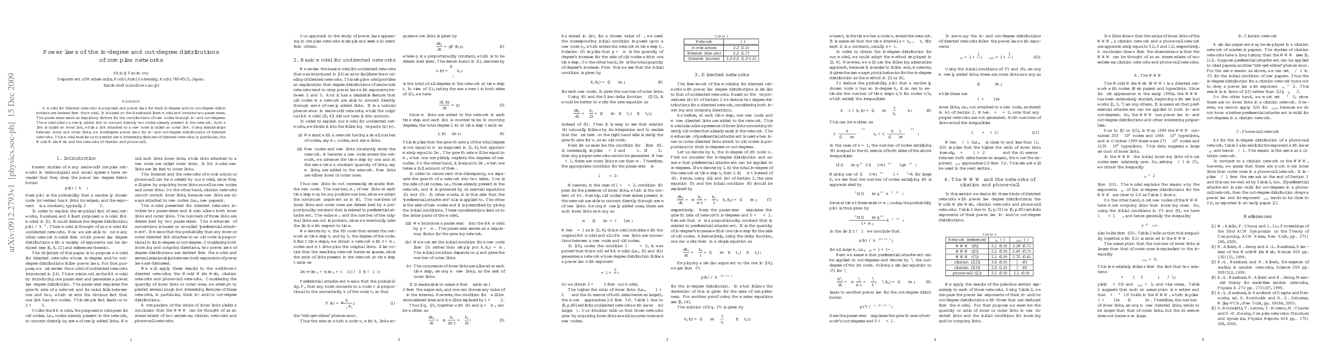 This paper proposes a directed network model based on the Barabási-Albert model with two parameters that regulate in-degree and out-degree contributions. It derives power laws for in-degree and out-degree distributions and explores their applicability to networks like the World Wide Web and citation networks.