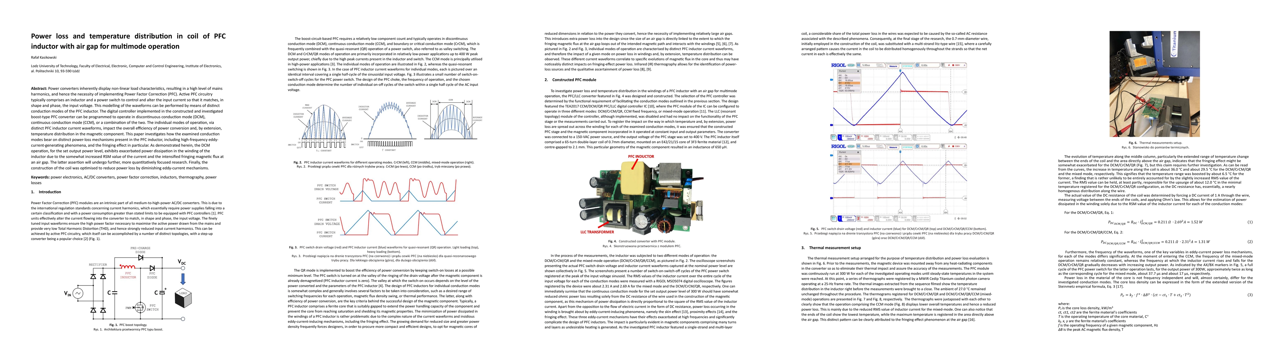 The research investigates power loss and temperature distribution in the coil of a PFC inductor with an air gap for multimode operation, utilizing a boost-type PFC converter with a digital controller programmable for DCM, CCM, or a combination of both modes.
