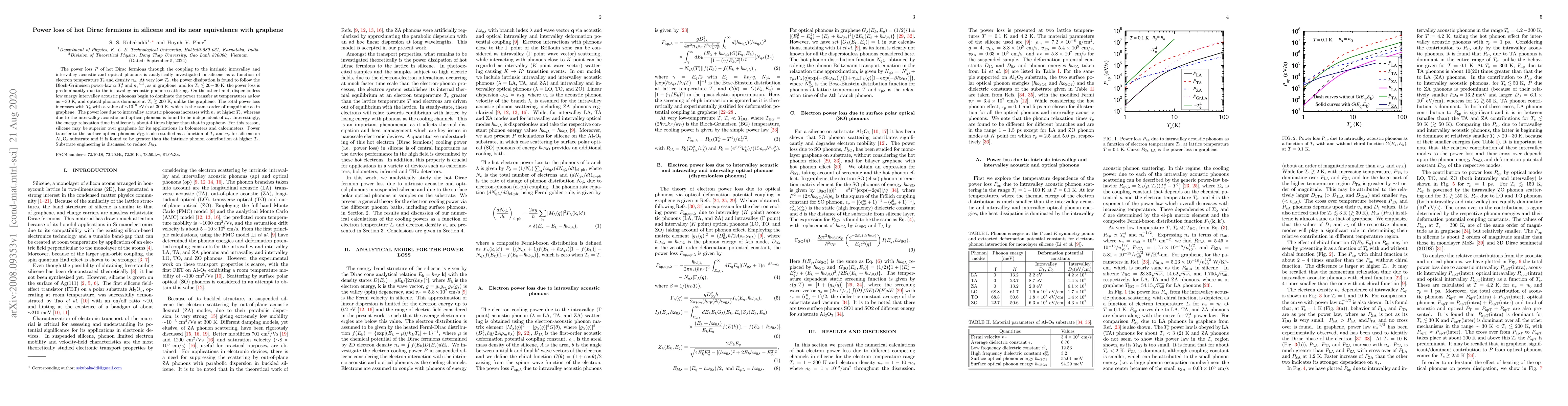 This paper investigates the power loss mechanisms in silicene due to hot Dirac fermions coupling with intrinsic phonons, finding similar power dissipation behavior to graphene but with distinct differences. At low temperatures, intravalley acoustic phonon scattering dominates, while intervalley and optical phonons take over at higher temperatures. Silicene's energy relaxation time is four times greater than graphene's, potentially making it superior for applications in thermal detectors.