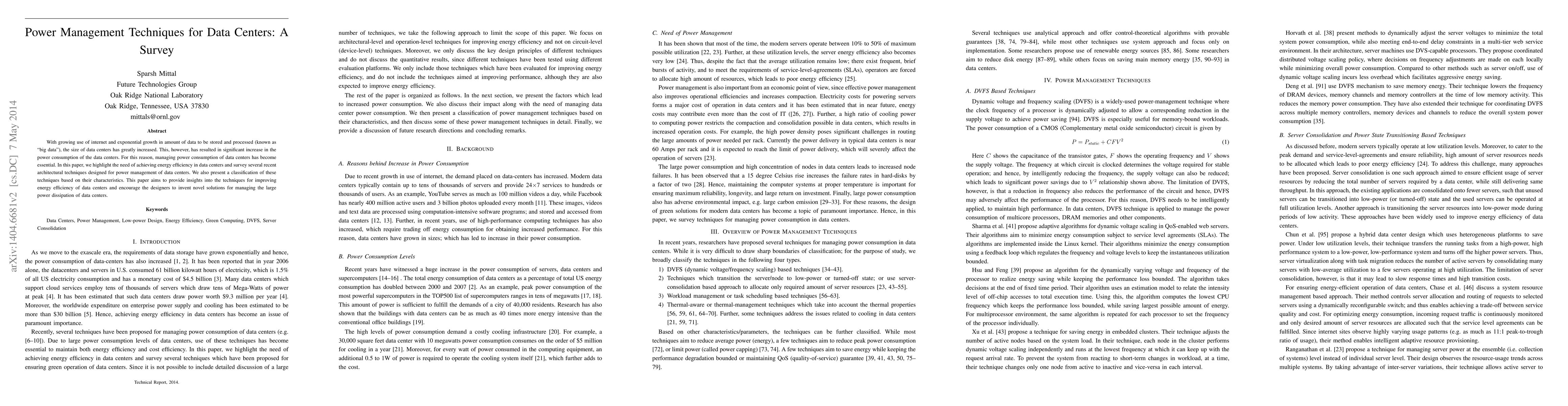 This paper surveys recent architectural techniques for managing power consumption in data centers, emphasizing the need for energy efficiency due to the exponential growth of data. It classifies these techniques and aims to inspire new solutions for reducing power dissipation in large data centers.