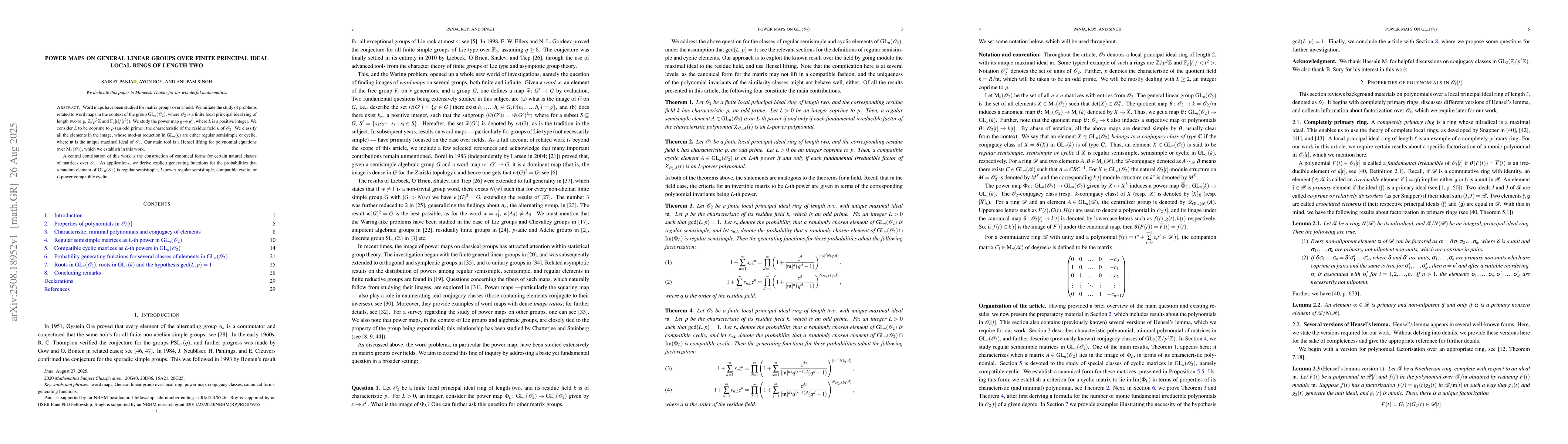 Word maps have been studied for matrix groups over a field. We initiate the study of problems related to word maps in the context of the group $\mathrm{GL}_n(\mathscr O_2)$, where $\mathscr O_2$ is a finite local principal ideal ring of length two (e.g. $\mathbb{Z}/p^2\mathbb{Z}$ and $\mathbb F_q[t]/\langle t^2\rangle$). We study the power map $g\mapsto g^L$, where $L$ is a positive integer. We consider $L$ to be coprime to $p$ (an odd prime), the characteristic of the residue field $k$ of $\mathscr O_2$. We classify all the elements in the image, whose mod-$\mathfrak m$ reduction in $\mathrm{GL}_n(k)$ are either regular semisimple or cyclic, where $\mathfrak m$ is the unique maximal ideal of $\mathscr O_2$. Our main tool is a Hensel lifting for polynomial equations over $\mathrm{M}_n(\mathscr O_2)$, which we establish in this work. A central contribution of this work is the construction of canonical forms for certain natural classes of matrices over $\mathscr O_2$. As applications, we derive explicit generating functions for the probabilities that a random element of $\mathrm{GL}_n(\mathscr O_2)$ is regular semisimple, $L$-power regular semisimple, compatible cyclic, or $L$-power compatible cyclic.