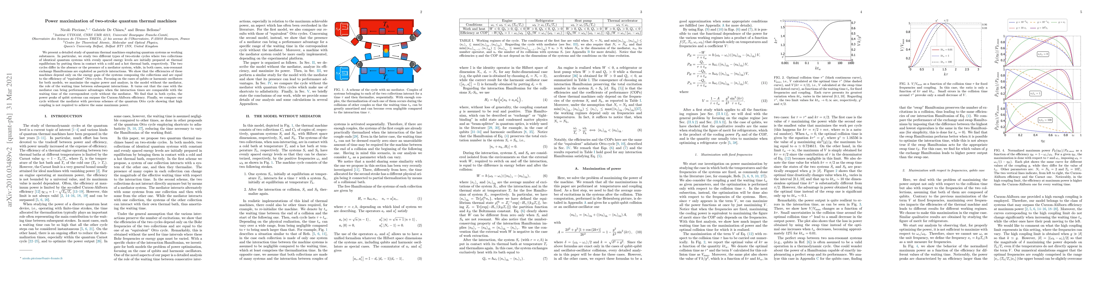 We present a detailed study of quantum thermal machines employing quantum systems as working substances. In particular, we study two different types of two-stroke cycles where two collections of identical quantum systems with evenly spaced energy levels are initially prepared at thermal equilibrium by putting them in contact with a cold and a hot thermal bath, respectively. The two cycles differ in the absence or the presence of a mediator system, while, in both cases, non-resonant exchange Hamiltonians are exploited as particle interactions. We show that the efficiencies of these machines depend only on the energy gaps of the systems composing the collections and are equal to the efficiency of "equivalent" Otto cycles. Focusing on the cases of qubits or harmonic oscillators for both models, we maximize the engine power and analyze, in the model without the mediator, the role of the waiting time between subsequent interactions. It turns out that the case with the mediator can bring performance advantages when the interaction times are comparable with the waiting time of the correspondent cycle without the mediator. We find that in both cycles, the power peaks of qubit systems can surpass the Curzon-Ahlborn efficiency. Finally, we compare our cycle without the mediator with previous schemes of the quantum Otto cycle showing that high coupling is not required to achieve the same maximum power.