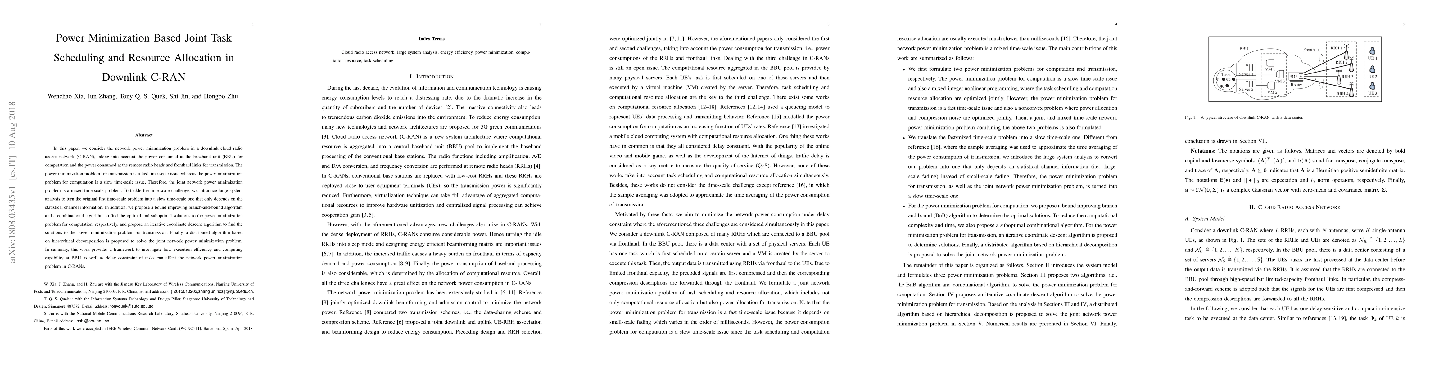 In this paper, we consider the network power minimization problem in a downlink cloud radio access network (C-RAN), taking into account the power consumed at the baseband unit (BBU) for computation and the power consumed at the remote radio heads and fronthaul links for transmission. The power minimization problem for transmission is a fast time-scale issue whereas the power minimization problem for computation is a slow time-scale issue. Therefore, the joint network power minimization problem is a mixed time-scale problem. To tackle the time-scale challenge, we introduce large system analysis to turn the original fast time-scale problem into a slow time-scale one that only depends on the statistical channel information. In addition, we propose a bound improving branch-and-bound algorithm and a combinational algorithm to find the optimal and suboptimal solutions to the power minimization problem for computation, respectively, and propose an iterative coordinate descent algorithm to find the solutions to the power minimization problem for transmission. Finally, a distributed algorithm based on hierarchical decomposition is proposed to solve the joint network power minimization problem. In summary, this work provides a framework to investigate how execution efficiency and computing capability at BBU as well as delay constraint of tasks can affect the network power minimization problem in C-RANs.