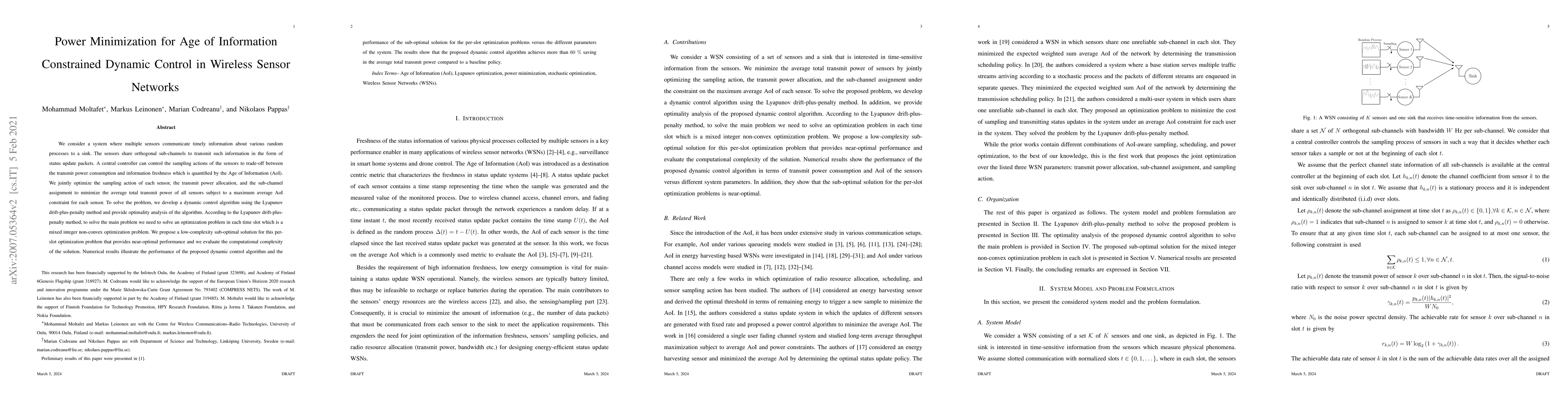 This paper proposes a dynamic control algorithm to minimize power consumption in wireless sensor networks while maintaining information freshness, achieving over 60% savings compared to baseline policies.