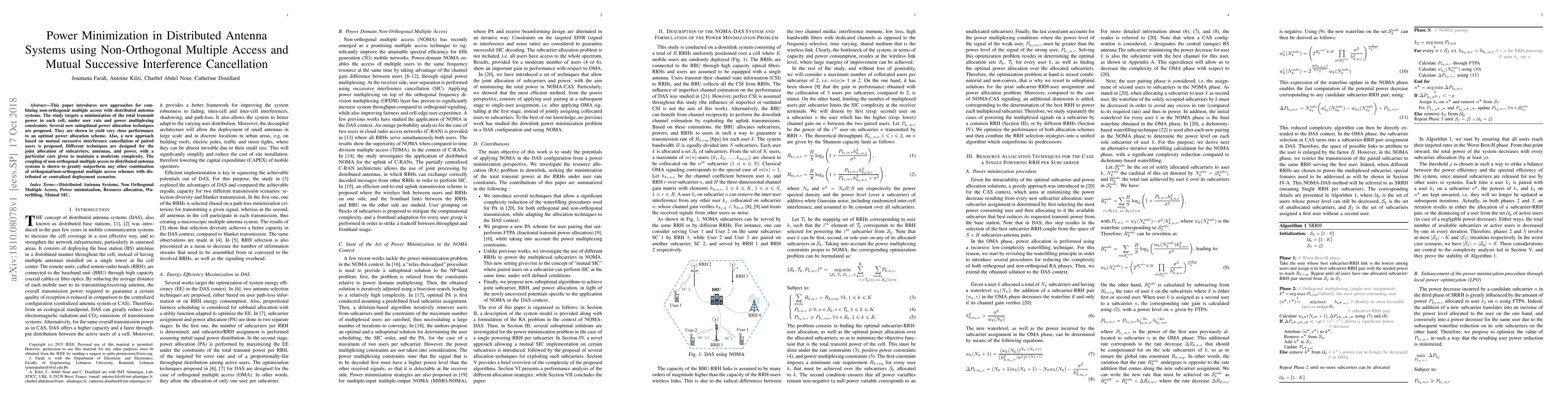 This paper proposes new power allocation techniques for distributed antenna systems using non-orthogonal multiple access with mutual successive interference cancellation, achieving near-optimal power minimization while maintaining moderate complexity. The combined approach outperforms other access schemes in distributed and centralized scenarios.