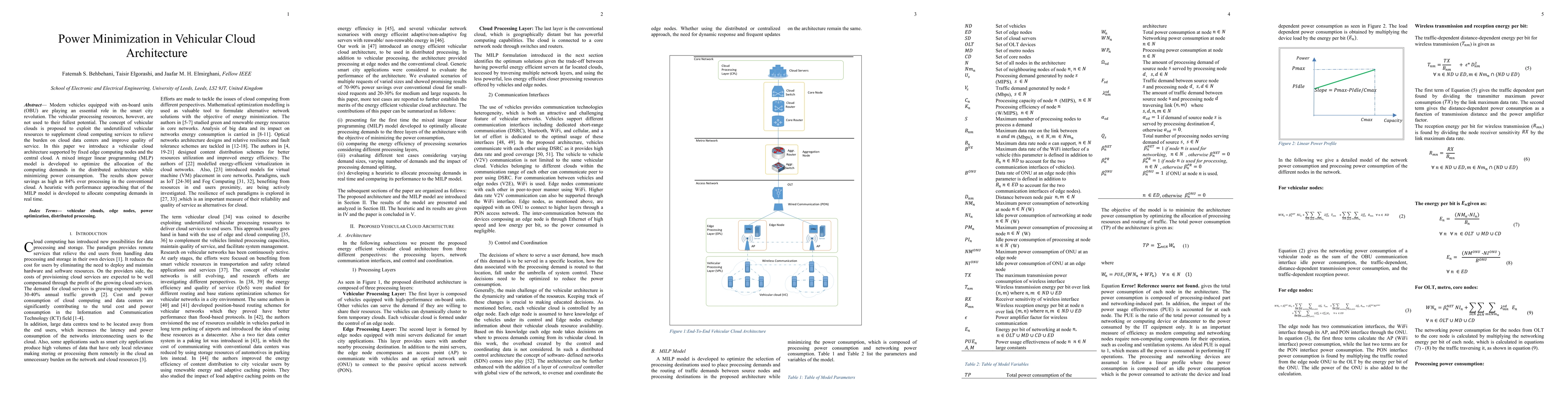 This paper proposes a vehicular cloud architecture to utilize underutilized vehicular resources, supported by fixed edge nodes and a central cloud, aiming to minimize power consumption. A mixed integer linear programming model optimizes the allocation of computing tasks, achieving up to 84% power savings compared to conventional cloud processing, with a heuristic developed for real-time demand allocation.