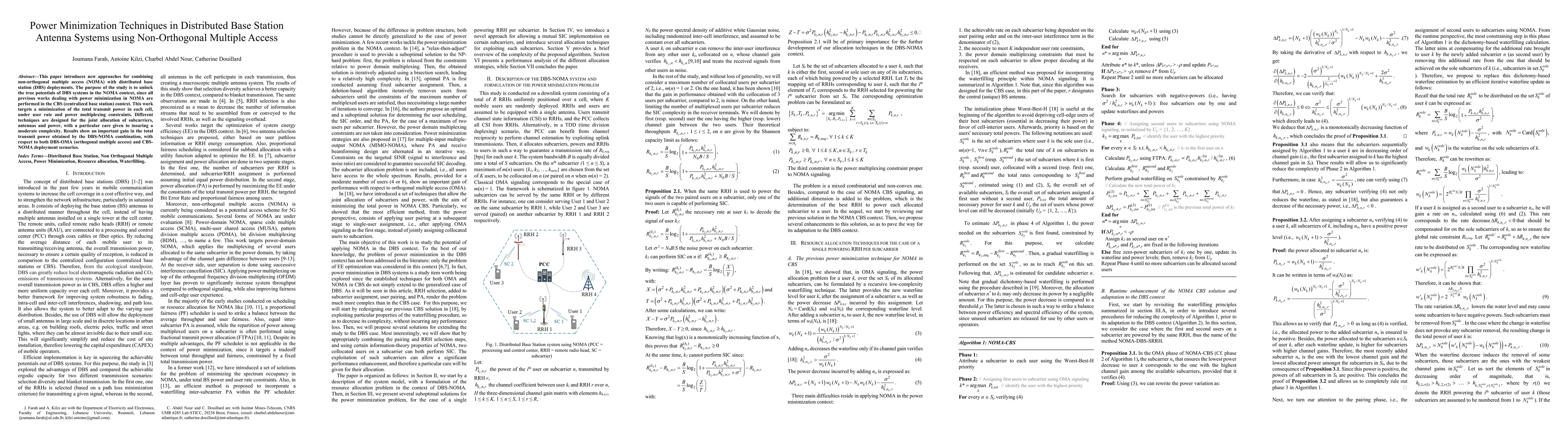 This paper proposes innovative power minimization techniques for distributed base station (DBS) systems using non-orthogonal multiple access (NOMA), achieving significant reductions in total transmit power compared to DBS-OMA and CBS-NOMA scenarios. The study focuses on optimizing subcarrier, antenna, and power allocation with manageable complexity.
