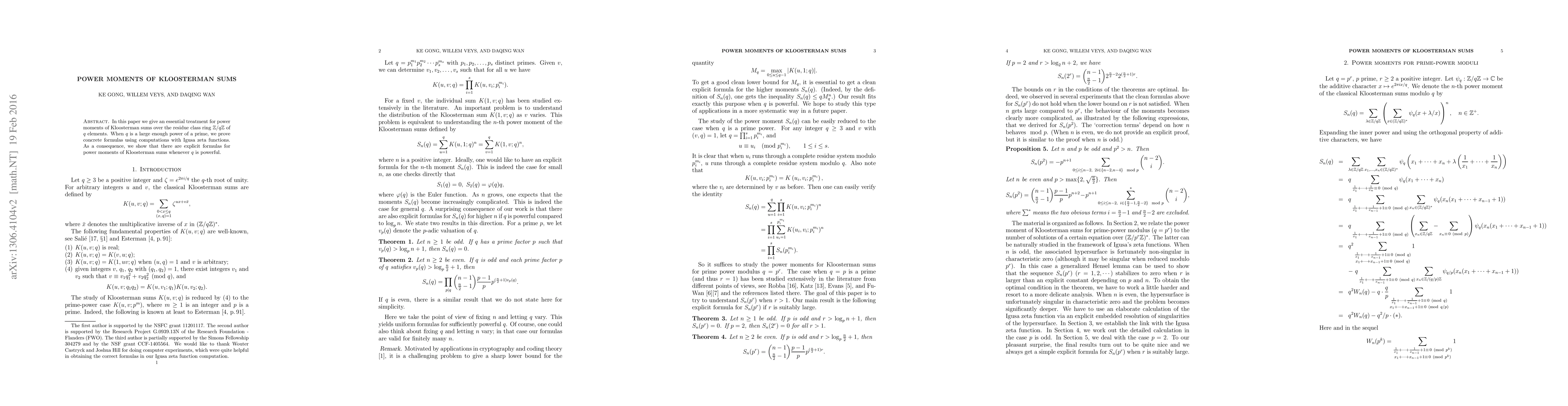 This paper provides explicit estimates for the power moments of Kloosterman sums over prime moduli and concrete formulas for prime-power moduli through computations involving Igusa zeta functions. The research focuses on estimating arbitrary integral power moments in these settings.