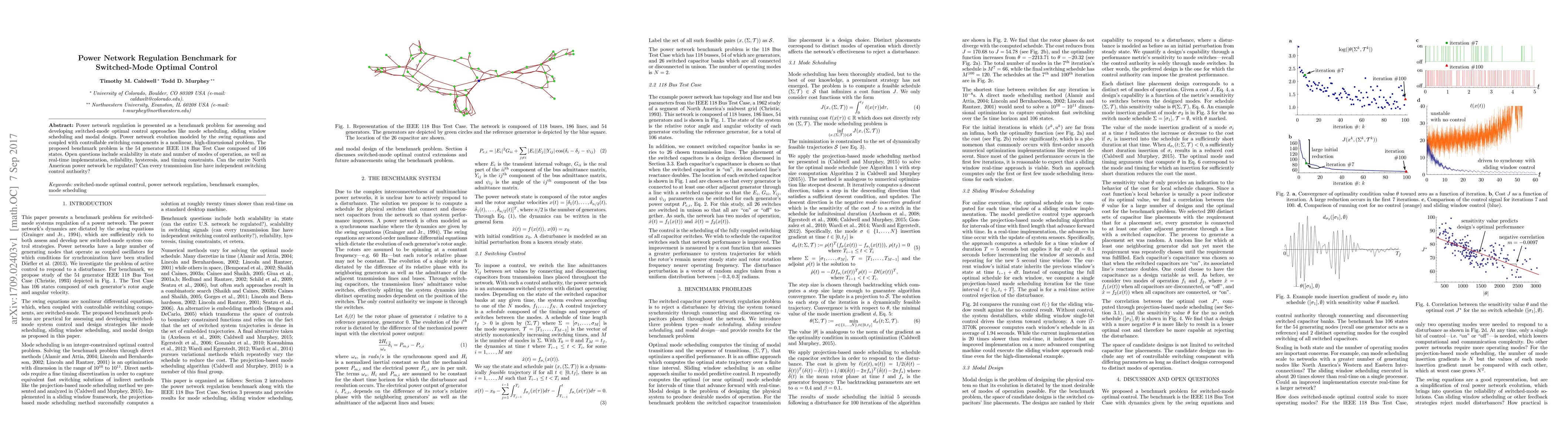This paper introduces a benchmark problem for evaluating switched-mode optimal control in power networks, focusing on the IEEE 118 Bus Test Case. It explores scalability, real-time implementation, and control authority for independent transmission line switching.